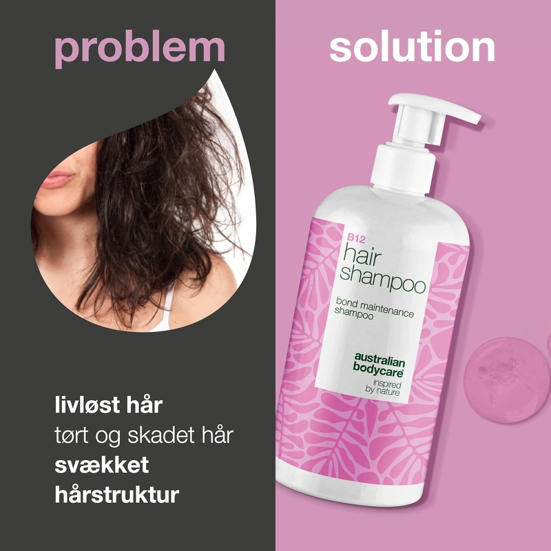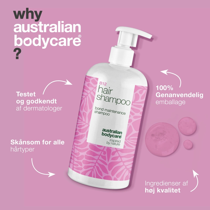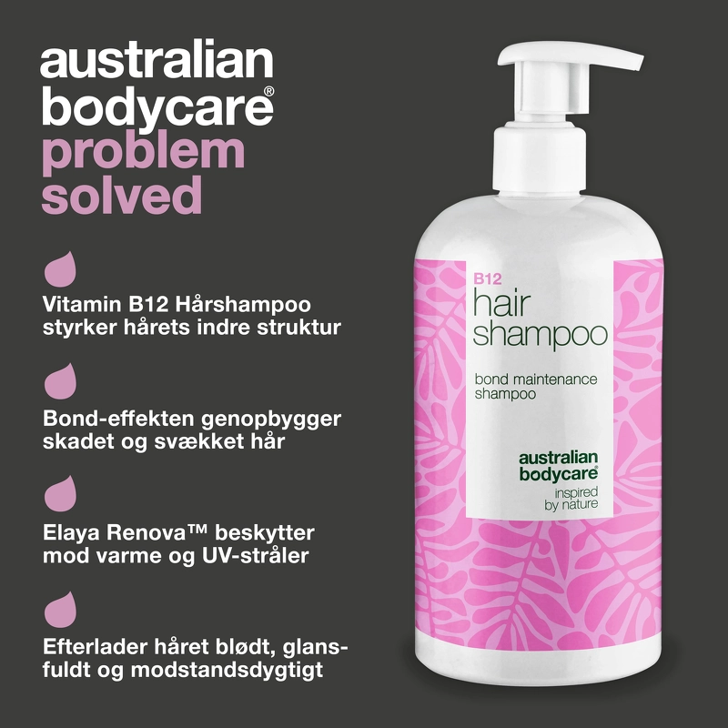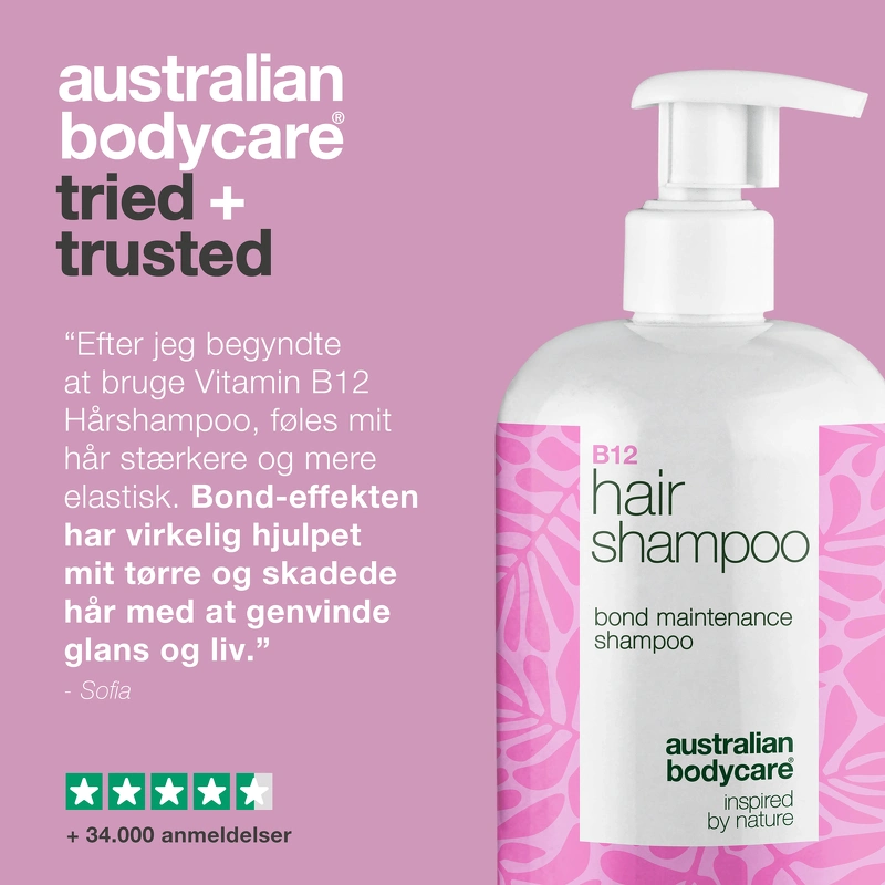 Das Australian Bodycare B12 Haarshampoo pflegt trockenes und strapaziertes Haar und schützt es mit einem Bond-Effekt. Angereichert mit Vitamin B12, Elaya Renova™ und Glycerin, stärkt es das Haar von innen heraus, repariert die Haarstruktur und spendet Feuchtigkeit, Glanz und Vitalität. Der einzigartige Bond-Effekt macht das Haar kräftiger und elastischer, während Moringa-Samenextrakt vor UV-Strahlung, Hitze und Umweltverschmutzung schützt. Saccharidisomerat und Glycerin binden Feuchtigkeit in Haar und Kopfhaut, und Vitamin B12 wirkt Glanzlosigkeit entgegen. Klinische Studien belegen eine Steigerung der Haarstärke um bis zu 38 %, der Haardicke um 14 %, eine Reduzierung von Rötungen um 32 % und eine Verbesserung des Feuchtigkeitsgehalts um 19 %. Vorteile: - Shampoo - Für dünnes, schwaches, coloriertes oder geschädigtes Haar - Pflegt trockenes und geschwächtes Haar - Stärkt die Haarfasern von innen - Baut die Haarstruktur wieder auf - Spendet Feuchtigkeit und Glanz - Macht das Haar kräftiger und elastischer - Schützt vor Hitze, UV-Strahlung und Umwelteinflüssen - Bindet Feuchtigkeit in Haar und Kopfhaut - Reduziert Rötungen der Kopfhaut - Stärkt und verdickt das Haar Anwendung: - Auf das nasse Haar auftragen - In Kopfhaut und Längen einmassieren - Gründlich ausspülen - Täglich oder nach Bedarf anwenden - In Kombination mit dem Australian Bodycare B12 Haarconditioner verwenden