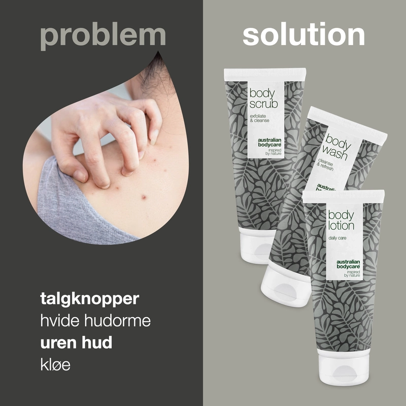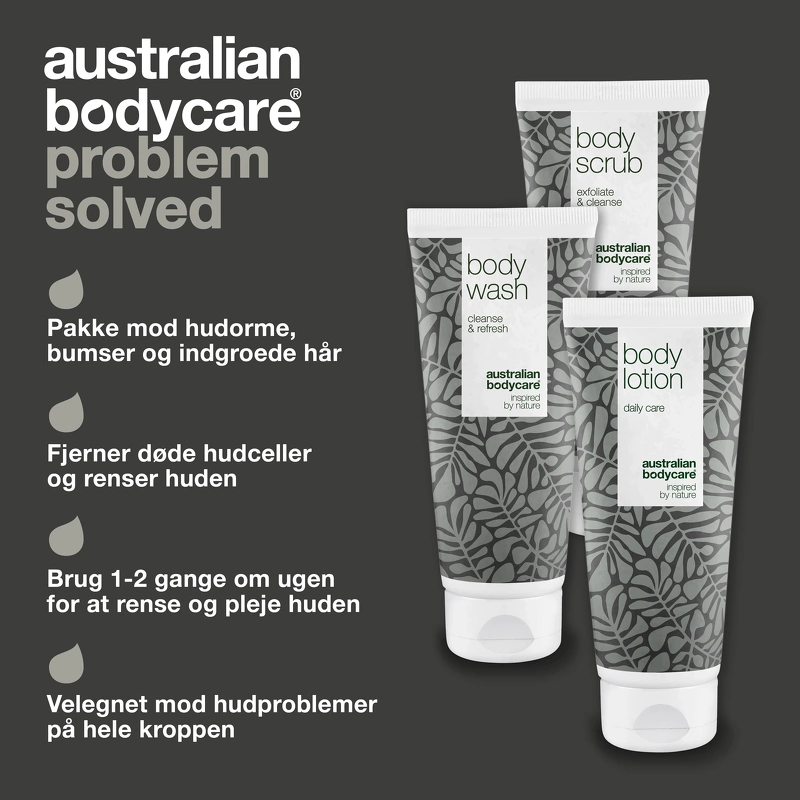 Das Australian Bodycare Anti-Blemish Body Kit ist ein köstliches Trio fantastischer Produkte, die absolut ideal für diejenigen unter Ihnen sind, die unter unreiner Haut und Pickeln am Körper leiden, z. der Rücken, die Oberarme, die Bälle usw Das Australian Bodycare Anti-Blemish Body Kit besteht aus einer Körperwäsche, einem Peeling und einer Körperlotion, die alle Teebaumöl enthalten, das für seine antibakteriellen Eigenschaften bekannt ist. So können Sie Ihren Körper mit diesen effektiven Produkten sowohl reinigen, peelen und pflegen, als auch dazu beitragen, Pickel zu reduzieren. Holen Sie sich Hilfe, um zu Unreinheiten neigende Haut zu reduzieren, und erhalten Sie mit diesem wunderbaren Australian Bodycare Anti-Blemish Body Kit einen schönen sauberen und gepflegten Körper. Das Set enthält: - 1 Stück. Australian Bodycare Body Wash 200 ml - 1 Stück. Australian Bodycare Körperpeeling 200 ml - 1 Stück. Australian Bodycare Bodylotion 200 ml