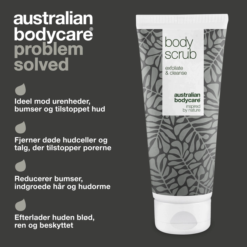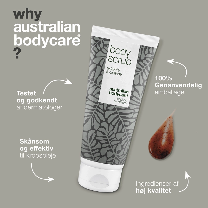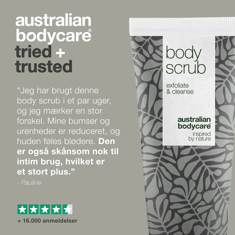 Australian Bodycare Body Scrub ist ein köstliches Peeling für den Körper. Es besteht aus zerkleinerten Aprikosensamen, die die Haut peelen und nach Gebrauch eine wirklich weiche und köstliche Haut ergeben. Darüber hinaus ist es natürlich mit australischem Teebaumöl, das Unreinheiten entfernt und gleichzeitig gründlich reinigt und so Hautproblemen vorbeugt. Es ist mit Allantoin und Glycerin angereichert, die eine weichmachende und feuchtigkeitsspendende Wirkung haben, was bedeutet, dass Ihre Haut weich und erfrischt bleibt. Aufgrund des Gehalts an natürlichem australischem Teebaumöl eignet sich dieses Körperpeeling hervorragend, wenn Sie unter Verunreinigungen des Körpers in Form von Pickeln, Mitessern oder Talgdrüsen sowie eingewachsenen Haaren leiden antibakteriell. Alle abgestorbenen Hautzellen werden entfernt und gleichzeitig ist es mild und hat keinen Einfluss auf den pH-Wert der Haut. Wie bei allen anderen Peelings wird die Verwendung bei entzündeten Ausbrüchen nicht empfohlen, da dies zur Verschlechterung des Zustands beitragen kann. Australian Bodycare Body Scrub kann für alle Hauttypen verwendet werden, auch für empfindliche Haut. Vorteil: - Bodyscrub Peeling mit zerdrückten Aprikosensamen - Tiefenreiniger - Verhindert Hautprobleme - Erweicht und spendet Feuchtigkeit - Gut gegen Unreinheiten am Körper - Wirkt antibakteriell - Milde Formel, die den pH-Wert der Haut nicht beeinflusst - Für alle Hauttypen - Dermatologisch getestet - Frei von Parabenen - Sulfat frei - Vegan Anwendung: - Auf die feuchte Haut auftragen - Mit kreisenden Bewegungen einmassieren - Mit Wasser spülen Zutatenliste: Aqua / Wasser, Samenpulver von Prunus Armeniaca (Aprikose), Coco-Glucosid, Glycerin, Coco-Betain, Acrylate / C10-30-Alkylacrylat-Crosspolymer, Phenoxyethanol, Melaleuca Alternifolia (Teebaum) Blattöl, Natriumchlorid, Glyceryloleade, Natrium, Kaliumsorbat, Natriumbenzoat, Zitronensäure, Allantoin, Tocopherol, Tetranatriumiminodisuccinat, hydriertes Palmglyceridcitrat, Lecithin, Ascorbylpalmitat, Limonen