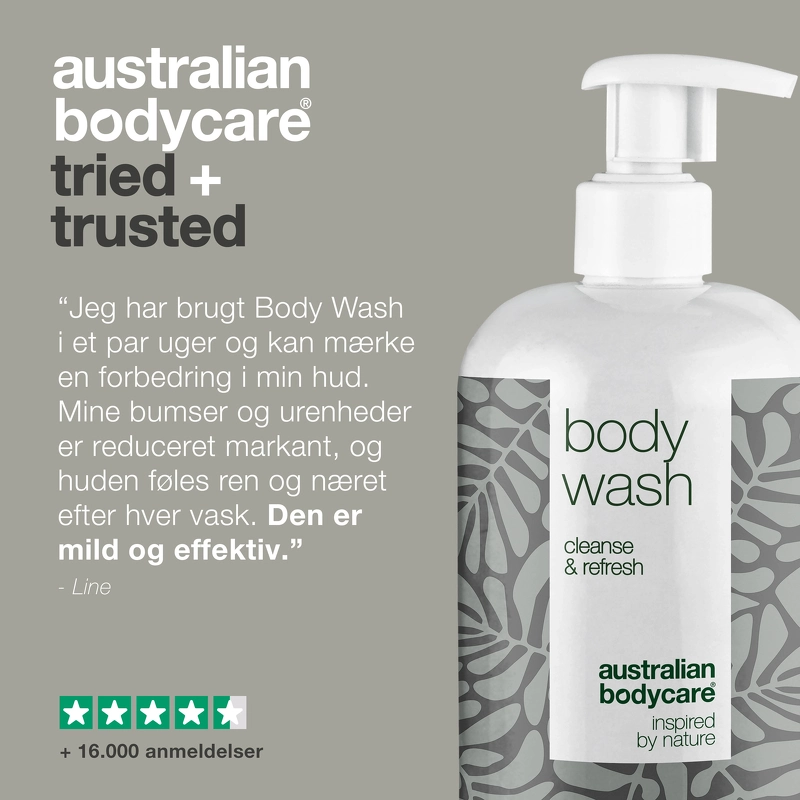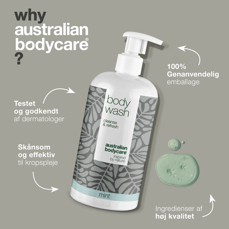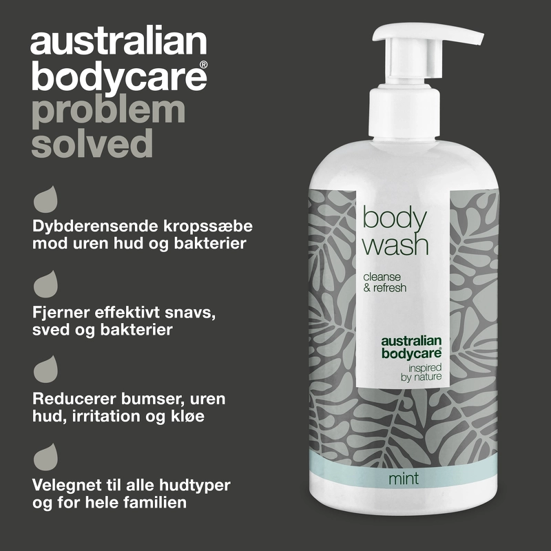 Australian Bodycare Body Wash Mint ist ein mildes Waschgel für den Körper. Dank des Gehalts an natürlichem, australischem Teebaumöl sorgt es für eine sanfte Reinigung des Körpers, ohne die Haut auszutrocknen, und beugt mit seinem Gehalt an natürlichen, antiseptischen Wirkstoffen Bakterien vor in der Haut stecken bleiben. Es enthält unter anderem Glycerin, das der Haut Feuchtigkeit spendet und hilft, den Feuchtigkeitshaushalt der Haut aufrechtzuerhalten. Dieser Variante wird auch Minze zugesetzt, die einen sauberen und frischen Duft verleiht und gleichzeitig eine schöne kühlende und beruhigende Wirkung auf die Haut hat. Holen Sie sich saubere, weiche und gesunde Haut mit Australian Bodycare Body Wash Mint. Vorteil: - Duschgel - Sorgt für eine sanfte Reinigung - Trocknet nicht aus - Verhindert die Ansiedlung von Bakterien auf der Haut - Spendet der Haut Feuchtigkeit - Mit einem sauberen und frischen Minzduft - Hält den Feuchtigkeitshaushalt der Haut auf einem Niveau - Frei von Parabenen - Vegan Anwendung: - Verteilen Sie die Seife auf der angefeuchteten Haut - Mit Wasser spülen - Kann täglich verwendet werden - Wenn das Produkt mit den Augen in Berührung kommt, sofort mit sauberem Wasser spülen Zutatenliste: Aqua / Wasser, Natriumlaurethsulfat, Coco-Betain, Melaleuca Alternifolia (Teebaum)-Blattöl, Natriumchlorid, Phenoxyethanol, Mentha Arvensis-Kräuteröl, Natriumbenzoat, Zitronensäure, PPG-20-Methylglukoseether, Kaliumsorbat, Tocopherol, Lavandula Angustifolia (Lavendel)-Öl, Tetranatriumiminodisuccinat, Linalool, Limonen, CI 75810 / Chlorophyllin-Kupfer-Komplex.