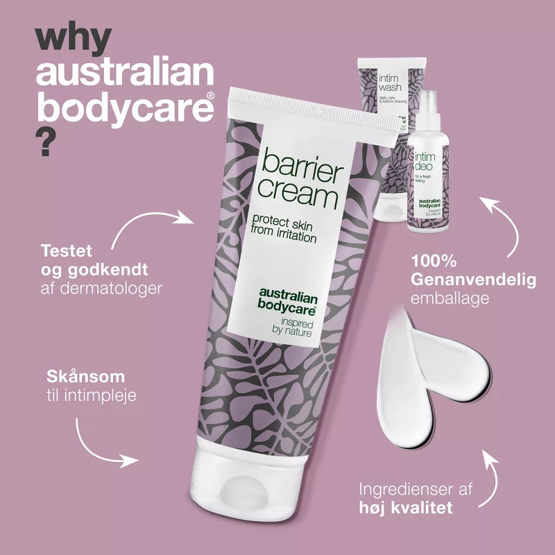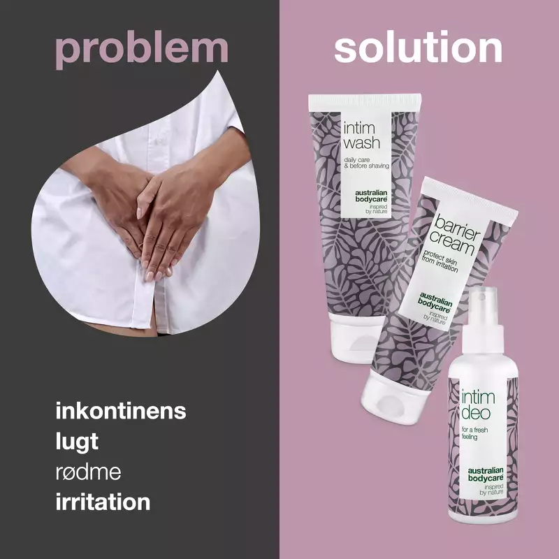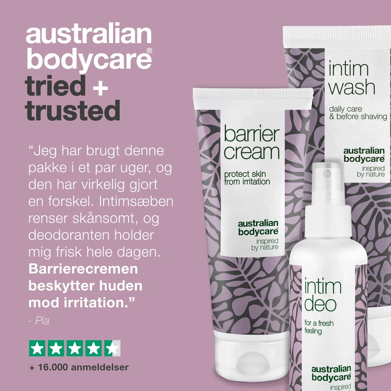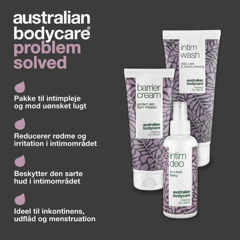 Australian Bodycare Comfort & Dryness ist eine Kombinationspackung mit 3 fantastischen Produkten, die Ihnen helfen können, wenn Sie an Inkontinenz leiden. Australian Bodycare Comfort & Dryness besteht aus einer milden Seife, die zur täglichen Reinigung des Intimbereichs verwendet werden kann. Außerdem erhalten Sie eine Barrierecreme, die die Haut vor Beschwerden schützt, die durch Inkontinenz entstehen können, wie z. B. unangenehmer Geruch, Juckreiz oder Rötungen. Zusätzlich bietet das Set ein Intim-Deo, das zur Auffrischung des Intimbereichs, zur Vorbeugung oder Beseitigung unangenehmer Gerüche, zur Kühlung, sowie zur Reduzierung von Irritationen und Juckreiz eingesetzt werden kann. Dieses Deo hat auch eine praktische Größe, wodurch es leicht für unterwegs ist. Sie möchten den Intimbereich optimal pflegen, der bei Inkontinenz für Trockenheit und Komfort sorgt? Dann ist Australian Bodycare Comfort & Dryness eine offensichtliche Wahl für Sie! Das Set enthält: - 1 Stück. Australian Bodycare Intimate Wash 200 ml - 1 Stück. Australian Bodycare Barrier Cream 100 ml - 1 Stück. Australian Bodycare Intim Deo 100 ml