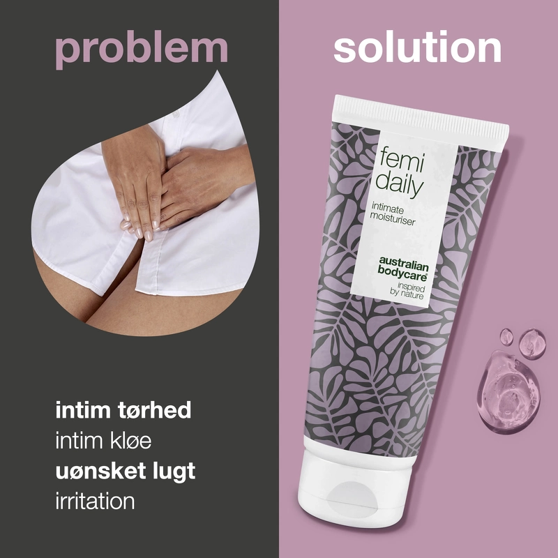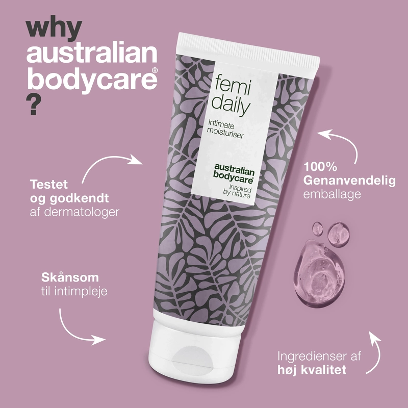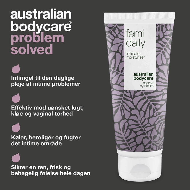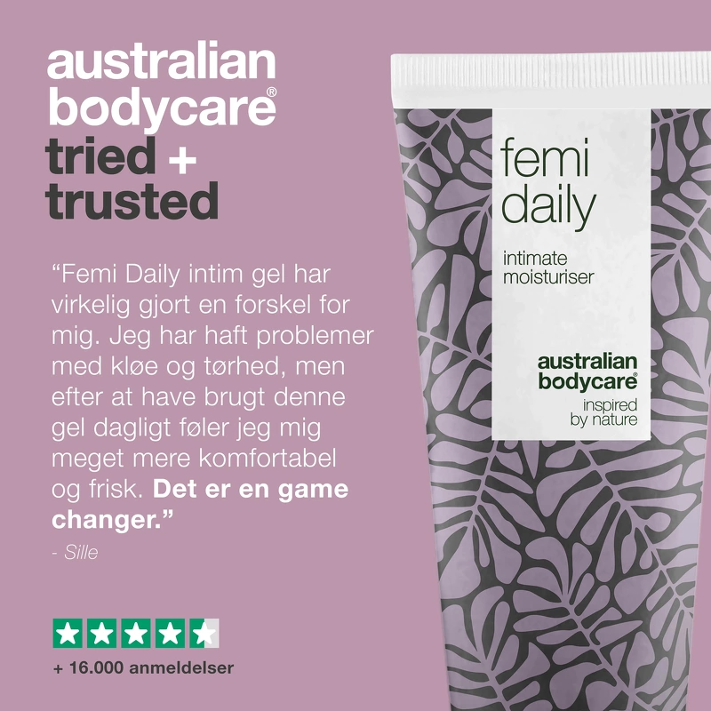 Australian Bodycare Femi Daily ist ein vorbeugendes Gel zur täglichen Pflege des Intimbereichs. Wenn Sie unter unerwünschten Gerüchen, Juckreiz, Trockenheit oder anderen Reizungen im Intimbereich leiden, kann Australian Bodycare Femi Daily helfen, diese Belästigungen zu lindern und zu verhindern . Australian Bodycare Femi Daily hat eine wasserbasierte, pH-angepasste und hormonfreie Formel , die dafür sorgt, dass Ihr Intimbereich gesund, frisch und sauber ist und gleichzeitig den natürlichen pH-Wert und die Bakterienflora respektiert. Das Gel enthält 100 % natürliches, australisches Teebaumöl, das Bakterien entgegenwirkt , die schlechte Gerüche und Hautreizungen verursachen können. Es hat auch eine feuchtigkeitsspendende und erweichende Wirkung, die hilft, Trockenheit um die Vaginalöffnung herum zu reduzieren. Das Gel kann auch bei Juckreiz und Reizungen am Penis, sowie am Anus verwendet werden. Dieses Gel ist auch dermatologisch und klinisch getestet und kann von jedermann verwendet werden - auch wenn Sie schwanger sind, stillen oder empfindliche Haut haben. Bei ausgeprägteren Genen wird empfohlen, [Australian Bodycare Femigel] (https://nicehair.dk/australian-bodycare-femigel-5-x-5-ml.html) als Heilmittel zu verwenden und dann Australian Bodycare zu verwenden Femi Daily als Präventionspflege. Wenn Sie die Intimbereiche mit Seife waschen möchten, empfiehlt es sich, immer eine pH-angepasste Intimseife zu verwenden, um das Gleichgewicht im Bereich nicht zu stören. Vorteil: - Gel für den Intimbereich - Wirkt Gerüchen, Trockenheit, Juckreiz und Reizungen entgegen und beugt sie vor Wasserbasierte, pH-angepasste und hormonfreie Formel - Hält den Intimbereich gesund, sauber und frisch - Feuchtigkeitsspendend und geschmeidig machend - Respektiert die natürliche Bakterienflora und den pH-Wert - Kann auch von Schwangeren, Stillenden und für empfindliche Haut verwendet werden - Dermatologisch getestet - Vegan - Frei von Parabenen Anwendung: - Wird im Intimbereich verwendet - Verteilen Sie eine kleine Menge Gel in den Intimbereichen, in denen Sie sich unwohl fühlen - 1-2 mal täglich nach Bedarf verwendet - Für den täglichen Gebrauch sind es bis zu 6-10 Wochen in einer Tube - Fühlen Sie sich frei, mit den anderen Produkten der anderen [Intimprodukte] von Australian Bodycare (https://nicehair.dk/hudpleje/kropspleje/intimpleje.html?brand=630&order_by=popular) zu kombinieren, um diese Bereiche optimal zu pflegen Zutatenliste: Aqua / Wasser, PEG-40 hydriertes Rizinusöl, Glycerin, 4-Terpineol, 1,2-Hexandiol, Xanthangummi, Melaleuca Alternifolia (Teebaum) Blattöl, Natriumchlorid, Natriumhydroxid, Zitronensäure, Hydroxyacetophenon.
