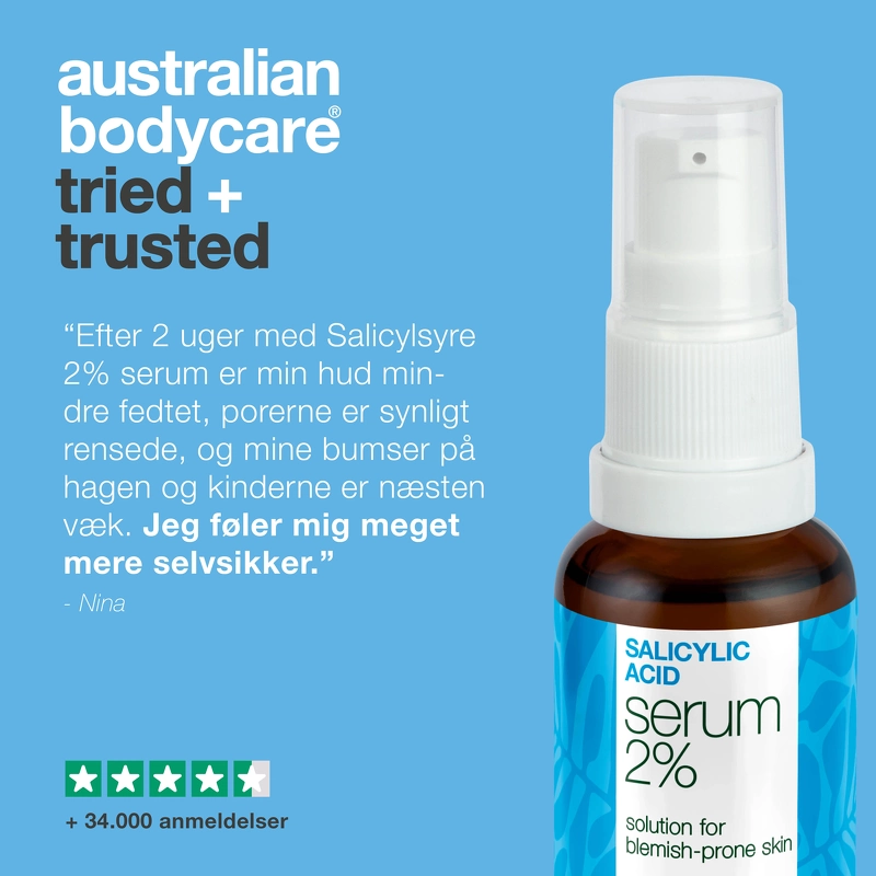 Das Australian Bodycare Salicylic Acid Serum – 2 % ist ein Serum für alle, die mit Pickeln, verstopften Poren und unebener Haut zu kämpfen haben. Das leichte, schnell einziehende Serum wurde für Gesicht und Körper entwickelt und wirkt effektiv mit natürlichen Inhaltsstoffen für sichtbar reinere, klarere und ebenmäßigere Haut. Fühlt sich die Haut fettig, gereizt und voller Unreinheiten an, kann dies das Selbstvertrauen und das Wohlbefinden beeinträchtigen – mit diesem Serum erhalten Sie jedoch ein Produkt, das Unreinheiten aktiv bekämpft, ohne Kompromisse bei Feuchtigkeit und Ausgeglichenheit einzugehen. Die Kombination aus 2 % Salicylsäure, Zink-PCA, Grüntee-Extrakt, Glycerin und Hyaluronsäure sorgt für eine effektive und dennoch sanfte Behandlung, die die Haut reinigt, beruhigt und regeneriert. Die Salicylsäure wirkt tiefenwirksam und entfernt abgestorbene Hautzellen und überschüssiges Öl, sodass die Poren sauber und weniger sichtbar bleiben. Zink-PCA reguliert die Talgproduktion und beugt neuen Unreinheiten vor, während Grüntee-Extrakt Rötungen und Reizungen reduziert. Gleichzeitig sorgen Glycerin und Hyaluronsäure dafür, dass die Feuchtigkeit erhalten bleibt und die Haut weich, glatt und angenehm bleibt – ohne zu spannen oder auszutrocknen. Das Ergebnis ist eine Haut, die sich sauberer, ebenmäßiger und frischer anfühlt – sowohl im Gesicht als auch am Körper. Viele erleben bereits nach kurzer Anwendungszeit deutlich weniger Pickel, weniger Rötungen und einen gesünderen Glanz. Das Australian Bodycare Salicylic Acid Serum 2% ist die natürliche, effektive und preiswerte Methode, das Hautgleichgewicht wiederherzustellen und eine Haut zu bekommen, die Sie jeden Tag zeigen möchten. Vorteile: - Serum - Reduziert Pickel und unreine Haut im Gesicht und am Körper - Reinigt die Poren porentief und beugt neuen Ausbrüchen vor - Sorgt für sichtbar reinere und ebenmäßigere Haut - Reduziert Rötungen und Reizungen - Gleicht die Haut aus, ohne sie auszutrocknen - Macht die Haut glatt, frisch und angenehm - Zieht schnell ein und hat eine leichte Konsistenz - Geeignet für Gesicht, Rücken, Brust und Schultern - Kann täglich als Teil Ihrer Hautpflegeroutine verwendet werden Anwendung: - Auf die saubere und trockene Haut auftragen - Bei Bedarf 1-2 Mal täglich anwenden - Eine dünne Schicht auf die freiliegenden Stellen auftragen - Lassen Sie das Produkt vor dem Auftragen von Creme oder Make-up einziehen Inhaltsstoffliste: Aqua/Wasser, Glycerin, Pentylenglykol, Propandiol, Salicylsäure, Zink-PCA, Camellia Sinensis-Blattextrakt, Natriumhyaluronat, Natriumhydroxid, Xanthangummi, Caprylylglykol, Phenoxyethanol, Tetranatriumiminodisuccinat, Zitronensäure, Kalium Sorbat, Natriumbenzoat