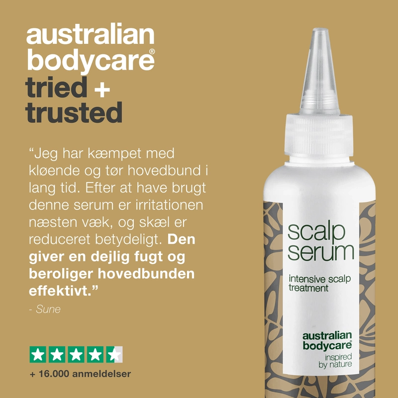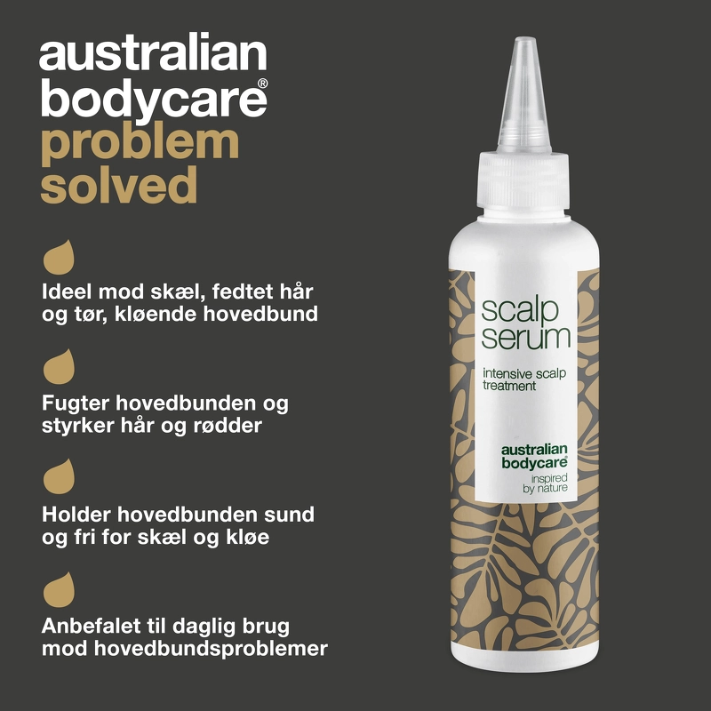 Australian Bodycare Scalp Serum ist ein hochwirksames Kopfhautserum, das bei Schuppen, Juckreiz, trockener oder gereizter Kopfhaut eingesetzt wird. Es ist mit Wirkstoffen angereichert, die eine wirksame feuchtigkeitsspendende und nährende Pflege bieten, die Haarwurzeln stärken sowie ein gesundes Gleichgewicht in der Kopfhaut wiederherstellen. Australian Bodycare Scalp Serum enthält unter anderem Teebaumöl, das antiseptisch wirkt und dabei hilft, Mikroorganismen entgegenzuwirken, die Schuppen, Juckreiz und Reizungen verursachen können. Gleichzeitig spendet Macadamianussöl der Kopfhaut einen Feuchtigkeitsschub, während Tasmanischer Pfeffer beruhigend auf Juckreiz und Irritationen wirkt. Dieses Serum fördert auch eine normale Talgproduktion in der Haut, was auch hilft, Schuppen und Juckreiz entgegenzuwirken. Mit Australian Bodycare Scalp Serum erhalten Sie ein wirksames Produkt zur Vorbeugung und Behandlung verschiedener Arten von Kopfhautproblemen, das Ihnen helfen kann, eine ruhigere und ausgeglichenere Kopfhaut wiederzuerlangen. Vorteil: - Kopfhautserum - Verhindert Schuppen, Juckreiz, trockene oder gereizte Kopfhaut - Hat eine antiseptische Wirkung - Stärkt die Haarwurzeln und spendet einen Feuchtigkeitsschub - Lindert Reizungen und Juckreiz - Vorbeugende Wirkung bei allen Arten von Kopfhautproblemen Fördert ein gesundes Gleichgewicht der Kopfhaut - Dermatologisch getestet - Ohne Parabene und Silikon - Vegan Anwendung: - Verteilen Sie das Produkt in der trockenen Kopfhaut - Produkt sanft einmassieren - Mindestens 30 Minuten einwirken lassen - aber auch am besten über Nacht, wenn möglich - Waschen Sie Ihr Haar gründlich mit [Australian Bodycare Hair Clean Shampoo] (https://nicehair.dk/australian-bodycare-hair-clean-shampoo250-ml.html) - Wird 2-4 mal pro Woche zur Behandlung verwendet - 1-2 mal pro Woche zur Vorbeugung verwendet - Kann auch im Bartbereich verwendet werden, um Juckreiz und Reizungen entgegenzuwirken Zutatenliste: Wasser / Aqua / Eau, Glycerin, PEG-7 Glyceryl Cocoate, Sodium Caproyl / Lauroyl Lactylate, Caprylic / Capric Triglycerid, Melaleuca Alternifolia (Teebaum) Leaf Oil, Macadamia Ternifolia Seed Oil, Allantoin, Tocopherol, Tasmannia Ianceolate Tasmannia Lance Caryophyllen, Acrylate / C10-30 Alkyl Acrylate Crosspolymer, Menthol, Carbomer, Xanthan Gum, Natriumhydroxid, Ethylhexylglycerin, Phenoxyethanol, Limonen, Linalool.