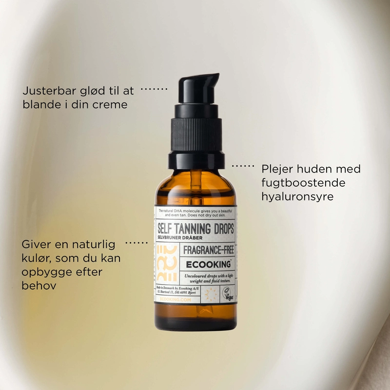 Ecooking Self Tanning Drops sind leichte Selbstbräunungstropfen, die Sie mit Ihren gewohnten Produkten mischen können, sodass Sie bei Ihrer Hautpflege keine Kompromisse eingehen müssen. Diese Tropfen sind für jedes Alter und jeden Hauttyp geeignet. Ein weiterer Vorteil ist, dass Sie die Farbmenge selbst dosieren können, indem Sie die Anzahl der Tropfen in Ihre Creme mischen. So können Sie die Farbmenge anpassen, je nachdem, ob Sie etwas Farbe für winterblasse Haut wünschen, eine gesunde Farbe für den Sommer aufbauen oder den vorhandenen Glanz erhalten möchten. Die Formel ist parfümfrei und ohne den von vielen gefürchteten Selbstbräunungsduft. Sie haben eine leichte, flüssige Konsistenz und lassen sich daher leicht in Ihre Creme mischen. Die Tropfen enthalten unter anderem: - Dihydroxyaceton (DHA), das aus Zuckerrüben oder Zuckerrohr gewonnen wird, ist der aktive und wirksame Bestandteil natürlicher Selbstbräunungsprodukte. Es verleiht eine natürliche Farbe, die gleichmäßig in die Haut eindringt. - Hyaluronsäure, die natürlich in der Haut vorkommt und die Haut beruhigt und mit Feuchtigkeit versorgt, ohne sie zu fetten. - Glycerin ist ein pflanzlicher Feuchtigkeitsspender, der aus Kokosnüssen gewonnen wird und der Haut Feuchtigkeit zuführt und sie bindet. - Gurkenextrakt ist ein hervorragender Feuchtigkeitsspender. Vorteile: - Selbstbräunungstropfen - Mischen Sie sie mit Ihren normalen Hautpflegeprodukten - Kann von jedem Alter und Hauttyp verwendet werden - Einstellbare Farbe durch Anzahl der Tropfen - Verleiht eine leichte Farbe, baut eine Sommerfarbe auf und erhält den Glanz - Ohne Parfüm und ohne typischen Selbstbräunungsduft - Leichte und flüssige Konsistenz, lässt sich leicht in Creme einmischen - Feuchtigkeitsspendend und beruhigend - Gleichmäßiges und natürliches Farbergebnis - Vegan, ohne Parfüm und dermatologisch getestet Anwendung: - Mischen Sie 2-3 Tropfen in Ihre Tages- oder Nachtcreme und tragen Sie sie wie gewohnt auf - Bauen Sie Ihre Farbe auf, indem Sie die Tropfen mehrere Tage hintereinander verwenden - Sie können die Selbstbräunungstropfen auch einfach mit Ihrer Körperlotion oder Körpercreme mischen und so auch Ihrem Körper etwas Farbe verleihen - Wenn Sie eine stärkere Farbe wünschen, können die Tropfen auch direkt auf der Haut verwendet werden - Denken Sie daran, Ihre Finger nach der Anwendung zu waschen Inhaltsstoffliste: Aloe Barbadensis Leaf Water, Aqua, Dihydroxyacetone, Cucumis Sativus Fruit Water, Propanediol, Dimethyl Isosorbide, Pentylene Glycol, Glycerin, Natriumhyaluronat, Natrium-PCA, Natriumlactat, Arginin, Asparaginsäure, PCA, Glycin, Alanin, Serin, Valin, Isoleucin, Prolin, Threonin, Histidin, Phenylalanin, Natriumbenzoat, Kaliumsorbat, Zitronensäure