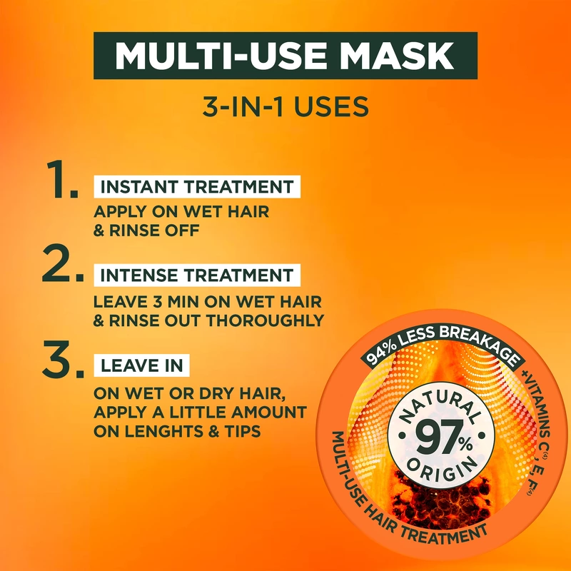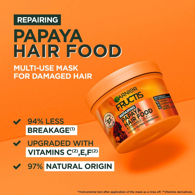 Die Garnier Fructis Hair Food Papaya Mask ist eine fantastische und herrlich duftende 3-in-1-Haarmaske für strapaziertes Haar. Sie kann beispielsweise als Spülung verwendet werden, die das Haar nährt, die Kämmbarkeit verbessert und es weich macht, ohne es zu beschweren. Alternativ kann sie auch als Maske verwendet werden, 3 Minuten einwirken lassen und anschließend ausgespült werden. So erhält das Haar zusätzliche Nährstoffe und intensive Feuchtigkeit. Außerdem wird Spliss reduziert. Zu guter Letzt kann sie als Leave-in-Creme in den Haarspitzen verwendet werden, um dem Haar Glanz und Gesundheit zu verleihen. Eine superleckere, vegane Maske, die zu 96 % biologisch abbaubar ist und zu 97 % aus natürlichen Inhaltsstoffen besteht. Vorteile: - 3-in-1-Haarmaske - Für geschädigtes Haar - Besteht zu 97 % aus natürlichen Inhaltsstoffen - Kann als Spülung, Maske oder Leave-in-Creme verwendet werden - Macht das Haar leichter kämmbar - Verleiht ein glänzendes und weiches Ergebnis, ohne es zu beschweren - Vegan - 96 % biologisch abbaubar - Hat einen wunderbaren Papaya-Duft - Reduziert Spliss - Hinterlässt repariertes und revitalisiertes Haar Anwendung: - Spülung: Auf das nasse Haar in den Längen auftragen, dann ausspülen - Maske: Die Maske auf das nasse Haar auftragen und 3 Minuten einwirken lassen, dann gründlich ausspülen - Leave-in: Eine kleine Menge des Produkts in die Spitzen des nassen oder trockenen Haares verteilen und einwirken lassen Inhaltsstoffliste: AQUA / WATER • CETEARYL ALCOHOL • STEARAMIDOPROPYL DIMETHYLAMINE • ISOPROPYL MYRISTATE • CETYLE ESTERS • HELIANTHUS ANNUUS SEED OIL / SUNFLOWER SEED OIL • GLYCIN-SOJAÖL / SOJABOHNENÖL • CARICA-PAPAYA-FRUCHTEXTRAKT / PAPAYA-FRUCHTEXTRAKT • BUTYROSPERMUM-PARKII-BUTTER / SHEABUTTER • GLYCERIN • GLYCERYL-LINOLEAT • GLYCERYL-LINOLENAT • GLYCERYL-OLEAT • ASCORBYLGLUCOSID • CAPRYLYLGLYKOL • ZITRONENSÄURE • WEINSÄURE • TOCOPHEROL • KALIUMSORBAT • SALICYLSÄURE • KARAMELL • LINALOOL • GERANIOL • LIMONEN • BENZYLALKOHOL • PARFÜM / DUFTSTOFF (DATEI Z70039524/1).