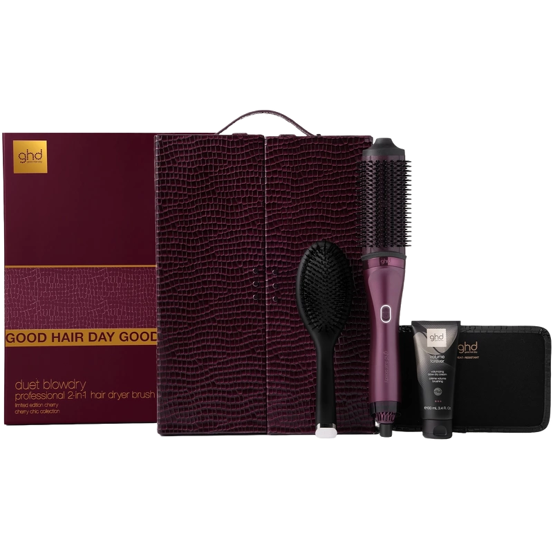 Gönnen Sie sich dieses Weihnachten eine Welt glamourösen Stylings mit der ghd Cherry Chic Kollektion. Mit einem satten und verführerischen Kirschton und inspiriert von Luxusreisen lädt Sie dieses Set in limitierter Auflage dazu ein, verführerische und zeitlose Good Hair Days zu genießen. Das Set enthält die professionelle ghd Duet Blowdry™ 2-in-1-Haartrocknerbürste, die volumengebende ghd Volume Forever™ Föhncreme, die ovale ghd The Dresser Stylingbürste und einen luxuriösen, reiseinspirierten Kulturbeutel mit kirschrotem Lack-Finish. ghd Duet Blowdry™ setzt neue Maßstäbe im Haarstyling als unsere erste 2-in-1-Haartrocknerbürste, die das Haar gleichzeitig trocknet und stylt und Ihnen den schnellsten Weg zu einfachem und glattem Föhnen zu Hause ermöglicht. Verabschieden Sie sich von extremen Hitzeschäden und begrüßen Sie gesünderes Haar, unabhängig vom Haartyp. Mithilfe der Heat-Air Xchange Technology™ leitet der kompakte und dennoch leistungsstarke Motor den Luftstrom durch ein energieeffizientes Heizelement und ein einzigartiges aerodynamisches System. Dadurch wird der Luftstrom in Wärmeenergie umgewandelt, die die elliptische Zylinderoberfläche und die verwicklungsfreien Borsten erhitzt, sodass Sie Ihr Haar gleichzeitig trocknen und stylen können. Keine Hitzeschäden, keine Kompromisse – nur makellose Ergebnisse in einem mühelosen Zug. Mit Sensoren, die die Temperatur 400 Mal pro Sekunde überwachen, hält der ghd Duet Blowdry™ eine konstant niedrige Temperatur für leistungsstarkes Styling. Perfekt positionierte Luftkanäle und beheizte Borsten machen es einfacher als je zuvor, makellose, voluminöse Föhnfrisuren mit 50 % mehr Glanz und einem kräuselfreien Finish zu kreieren. Der beheizte Zylinder und die Borsten liefern den Schwung, die Form und das Finish, die Sie von einem Föhn aus dem Salon erwarten, aber mit dem Komfort eines einzigen Geräts, das Ihre Routine rationalisiert und Ihren Zeitaufwand reduziert. Das maßgeschneiderte, geräuscharme Akustiksystem sorgt außerdem für ein verfeinertes Erlebnis, egal ob Sie zu Hause oder im Salon stylen. Set enthält: - 1 Stk. ghd Duet Blowdry 2-In-1 Haartrocknerbürste - 1 Stk. ghd The Dresser Oval Brush - 1 Stk. ghd Volume Forever 100 ml - 1 Stk. ghd Zurück