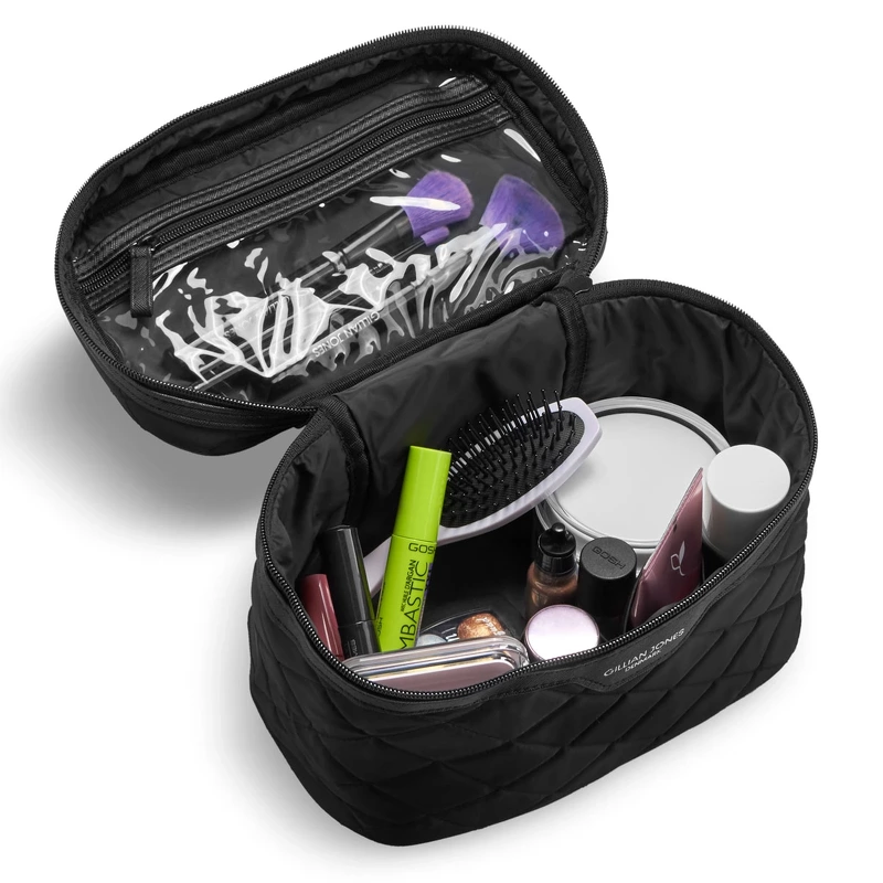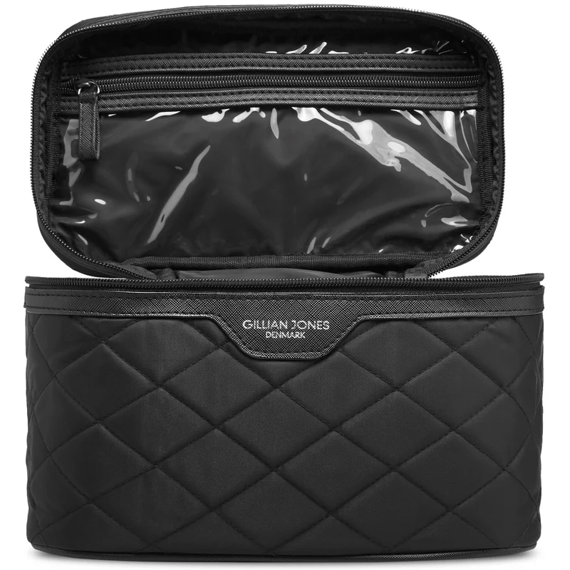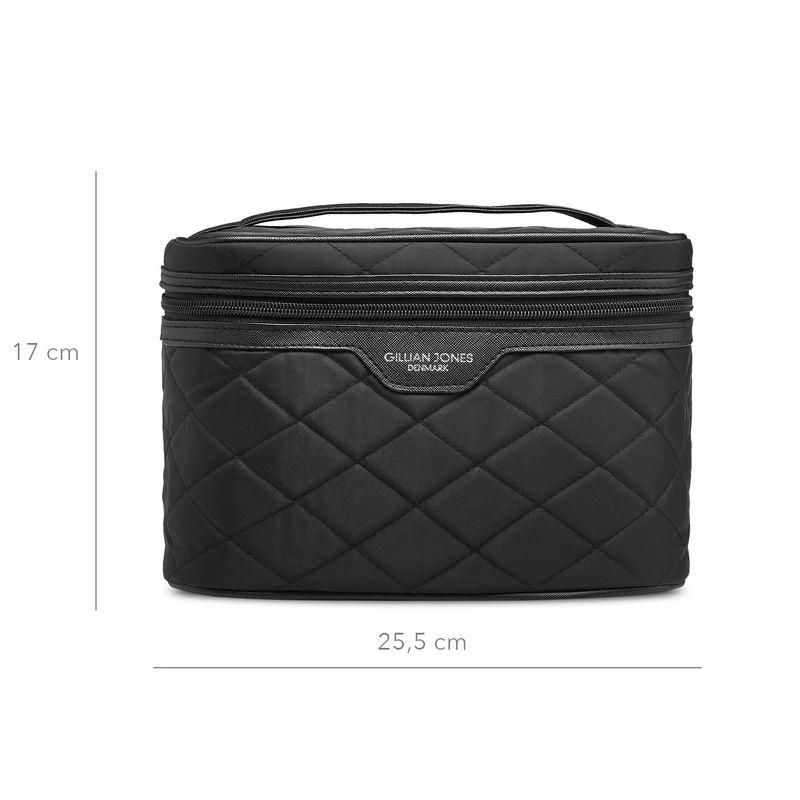 Gillian Jones Urban Travel Box ist eine große und sehr geräumige Kulturtasche aus schwarzem Steppstoff. Es gibt ein großes Fach, in dem Sie Platz für all Ihre Lieblingsprodukte haben, sowie eine Innentasche, in der Sie kleinere Dinge verstauen können. Die praktische Größe der Kulturtasche macht es gut für die Frau, die ungern fehlen möchte alles, auch wenn sie in den Urlaub fährt. Die Tasche ist sehr zeitlos, und mit dem Griff oben ist sie einfach und sehr praktisch für unterwegs. Jedes Jahr landen mehrere Tonnen Plastik in den Weltmeeren. Gillian Jones unterstützt den Kampf dagegen und ist daher in dieser Tasche aus recyceltem Kunststoff (RPET) gefüttert. Einzelheiten: - Kulturbeutel - Maße: H 17 cm, B: 25 cm, T: 14 cm - Farbe schwarz - Guter und sehr geräumiger Kulturbeutel - Mesh-Innentasche - Das Futter ist aus recyceltem Kunststoff hergestellt