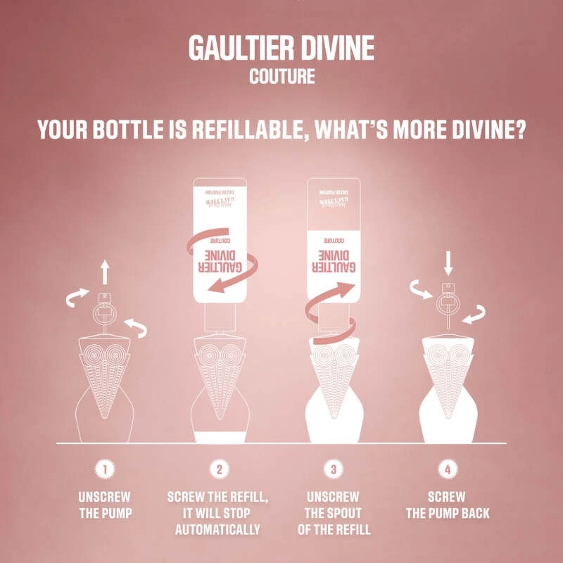 Jean Paul Gaultier Gaultier Divine Couture EDP Refill ist ein Nachfüller für Ihren Originalflakon und kann daher nicht separat verwendet werden. Damit können Sie Ihr Parfum günstig und umweltbewusst nachfüllen. In den pulsierenden Ateliers von Jean Paul Gaultier nimmt die Silhouette von Gaultier Divine Couture Gestalt an. Ein sinnliches, fruchtiges Amber-Eau de Parfum mit Haute-Couture-Glanz. Saftige Himbeere, kraftvolles Baiser und warmes Benzoeharz bilden die Grundlage für eine überaus sinnliche Anziehungskraft. Der pinkfarbene, nachfüllbare Flakon besticht durch ein goldenes Piercing und ein geflochtenes Korsett, das die himmlische Eleganz unterstreicht. Dies ist mehr als ein Duft; es ist ein Ausdruck von Stärke. Entfalten Sie Ihre göttliche Kraft. Dieser fruchtige Amberduft spricht für sich. Sinnlich und kühn eröffnet Gaultier Divine Couture mit einer strahlenden, saftigen Himbeernote. Leichtes, aber kraftvolles Baiser verschmilzt mit einer subtilen Süße. Am Boden umhüllt die sanfte, goldene Wärme von Benzoe die Haut wie ein Korsett. Unwiderstehlich und göttlich. Ihr formschöner Flakon und die tiefrosa Essenz verströmen eine unwiderstehliche Aura. Das ikonische, konische Korsett aus fein geflochtenem Gold verwandelt den Flakon in ein wahres Haute-Couture-Stück. Eine kühne, raffinierte Silhouette, kreiert in den Ateliers des Hauses. Ein goldener Zierring setzt den letzten Schliff. Ein verführerisches Juwel, signiert Gaultier. Auf ihrem elfenbeinfarbenen Etui erstrahlt eine leuchtend rosa Sonne. Mit in ein skulpturales Flechtwerk eingewebtem Goldfaden erstrahlt die Couture-Signatur mit göttlicher Selbstsicherheit. Kühn, verführerisch und ganz Gaultier.
