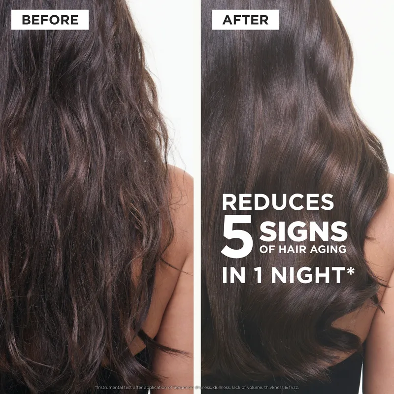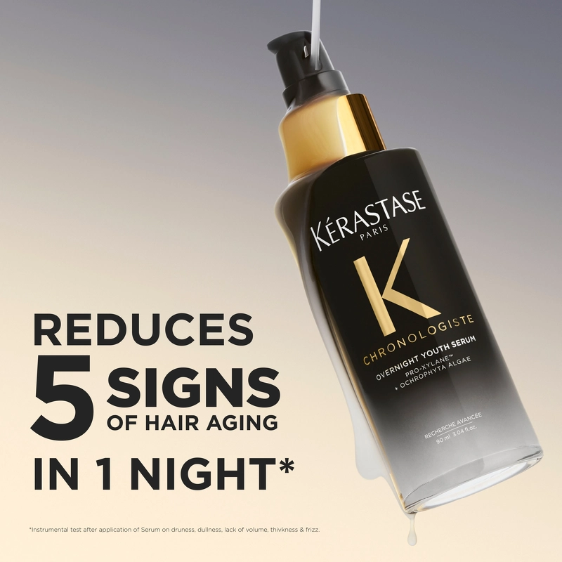 Das Kérastase Chronologiste Overnight Youth Serum ist eine gezielte Nachtpflege, die intensiv wirkt, während Sie schlafen, und Ihrem Haar ein jugendlicheres und gesünderes Aussehen verleiht. Als Teil der neuen Chronologiste-Serie bietet das Serum regenerierende Pflege für länger anhaltendes Haar – indem es nicht nur sichtbare Zeichen der Haaralterung reduziert, sondern auch geschwächtes Haar revitalisiert und die allgemeine Haargesundheit optimiert. Die Formel wurde entwickelt, um fünf Hauptanzeichen von alterndem Haar sichtbar zu verbessern: Frizz, Trockenheit, Glanzlosigkeit, mangelnde Dicke und fehlendes Volumen. Das Ergebnis ist kräftigeres, volleres und lebendigeres Haar. Das Geheimnis liegt in der Kombination zweier wirkungsvoller Inhaltsstoffe. Pro-Xylane im Serum ist ein bekannter Anti-Aging-Wirkstoff, der die Gewebeerneuerung von der Kopfhaut bis zur Haarfaser unterstützt. Er stimuliert die Aktivität des Haarfollikels, um den Durchmesser und die Dicke des Haarschafts zu erhöhen, während er gleichzeitig die Feuchtigkeit und Elastizität der Kopfhaut wiederherstellt und das Haarwachstum fördert. Ochrophyta-Algen, ein biologischer Tiefseeextrakt aus dem Bad und der Maske dieser Pflegeserie, stärken die Hautbarriere, verbessern die Feuchtigkeitsversorgung und spenden intensive Feuchtigkeit. Gleichzeitig beugt der Inhaltsstoff Spliss vor und verleiht dem Haar Glanz und Elastizität, indem er sich an die Haarproteine bindet. Das Regenerierende Nachtserum ist speziell für die Anwendung über Nacht entwickelt, um seine Wirkung zu maximieren. Inspiriert von den Prinzipien der Hautpflege, ermöglicht die Anwendung über Nacht den Wirkstoffen, länger einzudringen und zu wirken, während gleichzeitig die Auswirkungen täglicher Umwelteinflüsse minimiert werden. Durch die Nutzung der natürlichen nächtlichen Regenerationsphase des Körpers wird die Aufnahme optimiert, sodass sich das Haar am Morgen gesünder und leichter kämmbar anfühlt – und die abendliche Pflegeroutine zu einem Moment purer Entspannung wird. Vorteile: - Regenerierendes Nachtserum für die Haare - Reduziert sichtbare Zeichen der Haaralterung - Stärkt geschwächtes Haar - Verbessert Frizz, Trockenheit, Glanzlosigkeit, Dicke und Volumen - Sorgt für mehr Fülle und Durchmesser - Spendet Feuchtigkeit und stellt die Elastizität der Kopfhaut wieder her - Verleiht mehr Glanz und Geschmeidigkeit - Hilft gegen Spliss - Optimiert für die Anwendung über Nacht - Macht das Haar am Morgen gesünder und leichter kämmbar Anwendung: - Vor dem Schlafengehen auf trockenes oder handtuchtrockenes Haar auftragen - In Längen und Spitzen verteilen - Nicht ausspülen - Über Nacht einwirken lassen - Am Morgen wie gewünscht stylen Inhaltsstoffe: AQUA / WATER / EAU, DIMETHICONE, GLYCERIN, ISOPROPYL MYRISTATE, PHENOXYETHANOL, POLYACRYLAMIDE, C13-14 ISOALKANE, LAURETH-7, BENZYL SALICYLATE, HEXYL CINNAMAL, BENZYL ALCOHOL, LINALOOL TETRAMETHYLACETYLOCTAHRONAPHTHALENE, CARVONE, CITRUS AURANTIUM SCHALENÖL, LIMONEN, POGOSTEMON CABLIN ÖL, CITRONELLOL, LINALYLACETAT, GERANIOL, HYDROXYCITRONELLAL, MACROCYSTIS PYRIFERA EXTRAKT / KELP EXTRAKT, HYDROXYPROPYL TETRAHYDROPYRANTRIOL, BENZALDEHYD, GERANYLACETAT, CUMARIN, ZITRONENSÄURE, TRIMETHYLBENZENPROPANOL, ROSENKETONE, PROPYLENGLYKOL, BETA-CARYOPHYLLEN, KALIUMSORBAT, NATRIUMBENZOAT, PARFUM / DUFTSTOFF (FIL N70068793/1) ###### Hinweis: Die Inhaltsstoffliste des Produkts kann sich im Laufe der Zeit ändern. Überprüfen Sie immer die Zutatenliste auf der Verpackung des gekauften Produkts.