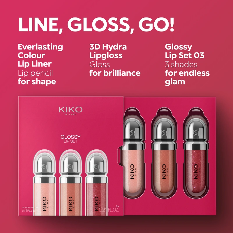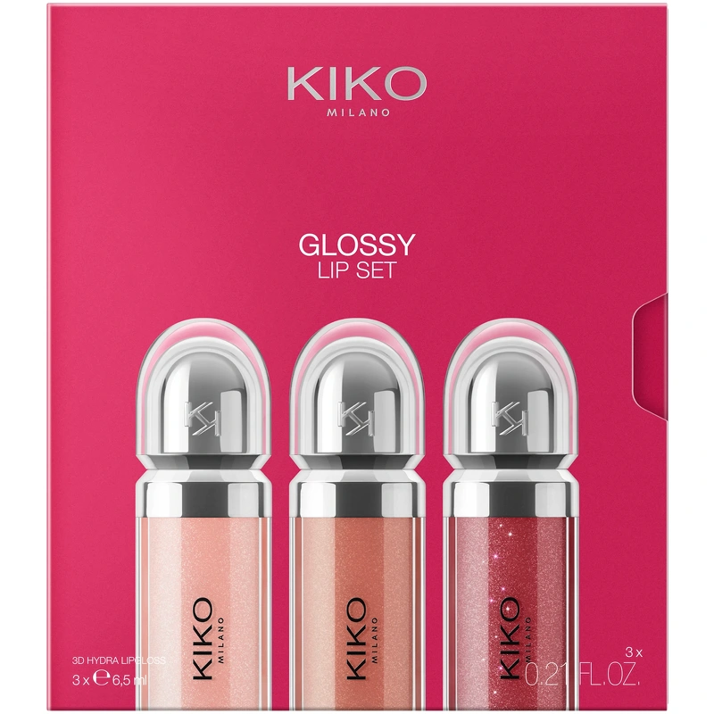 Das KIKO Milano Glossy Lip Set ist ein köstliches Set mit 3 der beliebten 3D Hydra Lipglosse von KIKO Milano für strahlend volle Lippen. Ein wahrhaft fantastisches Lippen-Set, das jedes Lächeln perfekt in Szene setzt. Die weiche Textur des Lipglosses fühlt sich wunderbar an, verschmilzt mit den Lippen und hinterlässt sie geschmeidig und strahlend. Die Formel enthält Bidens-Extrakt, der die Lippen mit Feuchtigkeit versorgt. Das Auftragen belebt Ihre Sinne und hinterlässt ein wunderbares Lippengefühl. Das Produkt lässt sich mühelos auftragen, fixiert sofort und hat eine nicht klebende, langanhaltende Textur. Der weiche Applikator verstärkt die Textur des Glosses und zeichnet präzise Lippenkonturen. Die pflegende Textur zaubert strahlende Lippen, die glatter und voller wirken. Was gibt es Besseres als einen 3D Hydra Lipgloss? Drei Stück. Verändern Sie Ihren Look jeden Tag und setzen Sie Ihre Lippen mit einem unwiderstehlichen Glanz in Szene, der alle Blicke auf sich zieht. Verwöhnen Sie sich selbst oder Ihre Liebsten mit diesem wunderschönen Set. Das Set enthält: - KIKO Milano 3D Hydra Lipgloss 6,5 ml - 06 Candy Rose - KIKO Milano 3D Hydra Lipgloss 6,5 ml - 19 Cream Cashmere - KIKO Milano 3D Hydra Lipgloss 6,5 ml - 22 Sparkling Red Garnet