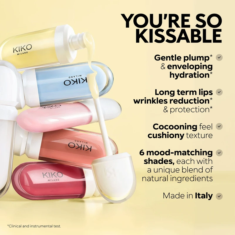 Die KIKO Milano Kissable Lip Volume Plumping Lip Cream ist eine glättende und feuchtigkeitsspendende Creme mit einem dezenten Volumeneffekt, die die Lippen perfekt in Szene setzt. Ein Bestseller für wunderschöne, sofort weichere, vollere und strahlendere Lippen. Diese Lippencreme pflegt die Lippen und sorgt gleichzeitig für ein geschmeidiges und voluminöses Gefühl. Sie vereint den Glanz eines Lipgloss mit den pflegenden Eigenschaften eines Lippenpflegeprodukts. Die balsamartige Formel mit italienischem Himbeerextrakt, Hyaluronsäure und Sheabutter spendet intensive Feuchtigkeit und verleiht ein wunderbar frisches Gefühl. Gleichzeitig verbessert sie die Lippenstruktur und sorgt für ein natürliches, strahlendes Finish. Die Formel hilft zudem, feine Linien auf den Lippen langfristig zu reduzieren und die Hautbarriere zu schützen. Die Textur ist cremig, geschmeidig und klebt nicht auf den Lippen. Der Volumeneffekt der Lippencreme verursacht kein Kribbeln, sondern hinterlässt ein leichtes, erfrischendes und angenehmes Gefühl. Jeder Pinselstrich umschmeichelt und umhüllt die Lippen und unterstreicht ihre Schönheit durch sanfte Feuchtigkeitspflege, einen subtilen Volumeneffekt und einen natürlichen Glanz. Vorteile: - Lippenbalsam - Volumengebender Effekt - Glättet und pflegt die Lippen - Spendet intensive Feuchtigkeit - Schützt die Hautbarriere - Verleiht strahlenden Glanz und natürliche Leuchtkraft - Cremige, geschmeidige und nicht klebrige Textur Anwendung: - Direkt auf die Lippen auftragen, von der Mitte nach außen zu den Mundwinkeln verblenden - Bei Bedarf mehrmals täglich anwenden - Für optimale Ergebnisse sollte das Produkt mindestens zweimal täglich verwendet werden Inhaltsstoffe: HYDROGENATED POLYDECENE, POLYBUTENE, HYDROGENATED STYROLE/ISOPRENE COPOLYMER, CAPRYLIC/CAPRIC TRIGLYCERIDE, ETHYLHEXYL PALMITATE, BIS-BEHENYL/ISOSTEARYL/PHYTOSTERYL DIMER DILINOLEYL DIMER DILINOLEATE, DIPENTAERYTHRITYL TETRAHYDROXYSTEARATE/TETRAISOSTEARATE ARATE, DIMETHYLISOSORBID, MENTHONGLYCERINACETAL, AROMA (GESCHMACK), PENTAERYTHRITYLTETRA-DI-T-BUTYLHYDROXYHYDROCINNAMAT, BUTYROSPERMUM PARKII BUTTER (BUTYROSPERMUM PARKII (SHEA) BUTTER), RUBUS IDAEUS SAMENÖL (RUBUS IDAEUS (HIMBEER) SAMENÖL), TOCOPHEROL, SESAMUM INDICUM SAMENEXTRAKT (SESAMUM INDICUM (SESAM) SAMENEXTRAKT), SILICA DIMETHYLSILYLAT, BUTYLENGLYKOL, MORUS ALBA RINDENEXTRAKT, CAPRYLYLGLYKOL, PHENOXYETHANOL, TRIHYDROXYSTEARIN, NATRIUMHYALURONAT, HEXYLENGLYKOL, GLUCOMANA. Kann Spuren enthalten von: CI 7789 1 (TITANDIOXID), CI 77491/ CI 77492/ CI 77499 (EISENOXIDE), CI 42090 (BLAU 1 LAKE), CI 77163 (WISMUTOXYCHLORID), CI 19140 (GELB 5 LAKE), CI 77742 (MANGAN). VIOLET), CI 15850 (ROT 7 LAKE, ROT 6, ROT 7), CI 15985 (GELB 6 LAKE), CI 45410 (ROT 28 LAKE), CI 73360 (ROT 30 LAKE).