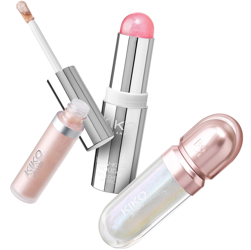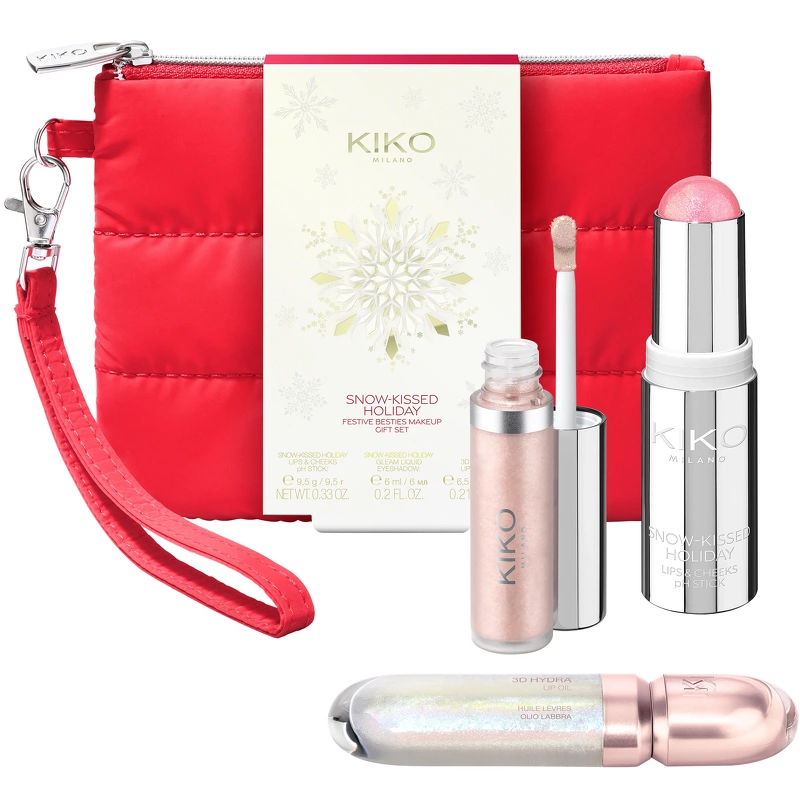 KIKO Milano SNOW-KISSED HOLIDAY Festive Besties Makeup Gift Set (Limited Edition) ist ein komplettes Make-up-Geschenkset für Augen, Gesicht und Lippen mit pH-reaktivem Stift für Wangen und Lippen, holografischem flüssigem Lidschatten und Lippenöl. Mit diesem Set funkeln Sie wie Schneeflocken in der Sonne! Der pH-reaktive Stift ist mit kaltgepresstem Bio-Hagebuttenöl formuliert und hat eine Textur, die beim Auftragen überrascht. Sie verwandelt und aktiviert sich bei Kontakt mit der Haut, sodass sich die Farbe an Sie und Ihre Wangen und Lippen anpasst. Das Stiftformat ermöglicht ein einfaches, ständiges Auffrischen und Hinzufügen eines strahlenden Glanzes. Der flüssige, holografische Lidschatten bringt Ihre Augen zum Leuchten, während sich die Farbe mit jeder Bewegung verändert, sodass der Ausdruck ständig verändert. Er ist leicht, flüssig und reichhaltig und lässt sich einfach auftragen und verblenden. Das Lippenöl spendet bis zu 10 Stunden Feuchtigkeit und hat eine glättende und umhüllende Textur mit einem leuchtenden Finish, das die Lippen pflegt und ihnen Glanz und einen Hauch von Farbe verleiht – eine unverzichtbare Wohltat, die Sie sich nicht entgehen lassen dürfen. Die 3 Produkte werden in einer schicken kleinen Kosmetiktasche im Daunenjacken-inspirierten Design mit Après-Ski-Charme geliefert. Der rote Stoff mit farblich passenden Nähten sorgt für einen raffinierten 3D-Effekt, während der silberne Reißverschluss, die Handschlaufe und das geprägte KK-Logo die Authentizität dieses Must-have-Accessoires unterstreichen. Dieses Set ist perfekt für die Frau, die mit einem strahlenden Make-up-Look mit viel Glitzer beeindrucken möchte. Machen Sie sich selbst oder einer geliebten Person eine Freude mit diesem edlen Set. Das Set enthält: – 1 Stk. KIKO Milano SNOW-KISSED HOLIDAY Lips & Cheeks pH Stick 9,5 gr. – 1 Stk. KIKO Milano SNOW-KISSED HOLIDAY Gleam Liquid Eyeshadow 6 ml – 1 Stk. KIKO Milano 3D Hydra Lip Oil 6,5 ml – 01 Milky Way – 1 Stk. KIKO Milano Kosmetiktasche Inhaltsstoffliste: SNOW-KISSED HOLIDAY LIPS & CHEEKS pH STICK – INHALTSSTOFFE: TRIDECYLTRIMELLITAT, HYDROGENIERTES POLYISOBUTEN, OCTYLDODECANOL, DIBUTYL-L-AUROYLGLUTAMID, DIBUTYL-ETHYLHEXANOYLGLUTAMID, TOCOPHERYLACETAT, AROMA (GESCHMACK), BUTYLENGLYKOL, ROSA-CANINA-FRUCHTÖL, ZITRONENSÄURE, KALZIUMALUMINIUMBOROSILIKAT, KIESELSÄURE, RICINUS COMMUNIS-SAMENÖL (RICINUS COMMUNIS (RIZINUS) SAMENÖL), TOCOPHEROL, ZINNOXID, CI 77891 (TITANDIOXID), CI 45410 (ROT 27), CI 15850 (ROTER SEE 7). SNOW-KISSED HOLIDAY GLEAM LIQUID EYESHADOW – INHALTSSTOFFE: AQU A (WASSER/EAU), CALCIUM ALUMINUM BOROSILICATE, GLYCERIN, MICA, PEG-8 DIMETHICONE, SILICA, ACRYLATES COPOLYMER, 1,2-HEXANEDIOL, ALCOH OL DENAT., HYDROXYACETOPHENONE, POTASSIUM SORBATE, SODIUM HYDROXIDE, TIN OXIDE, SODIUM HYALURONATE, CI 77891 (TITANDIOXID), CI 77491 (EISENOXIDE). 3D HYDRA LIP OIL 01 – INHALTSSTOFFE:* COCOGLYCERIDE, ETHYLCELLULOSE, CALCIUM-NATRIUM-BOROSILIKAT, SILICA, RUBUS IDAEUS-SAMENÖL (RUBUS IDAEUS (HIMBEER)-SAMENÖL), GLIMMER, ZINNOXID, PROPYLGALLAT, CALCIUM-ALUMINIUM-BOROSILIKAT, CALCIUM-TITANIUM-BOROSILIKAT, ALUMINIUMOXID, SYNTHETISCHES FLUORPHLOGOPIT, CI 77891 (TITANDIOXID), CI 77491 (EISENOXIDE).