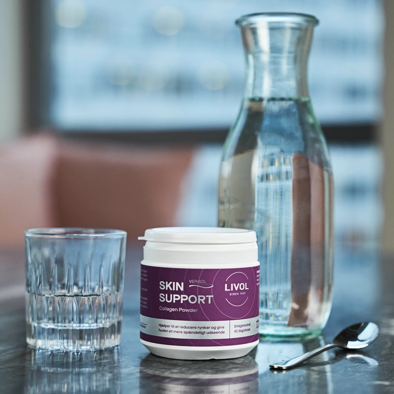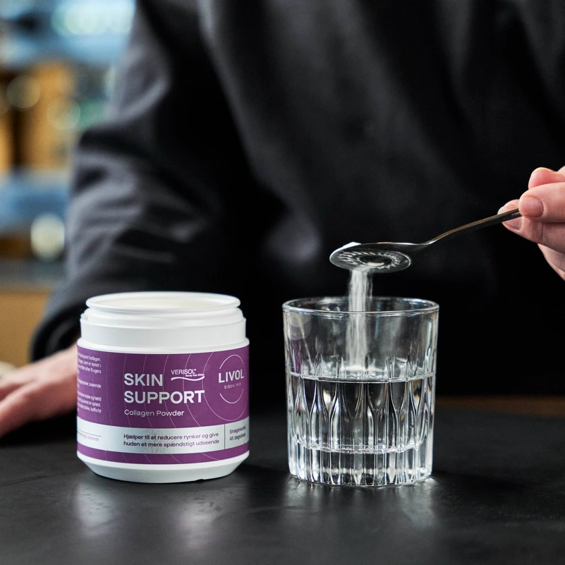 Livol Skin Support Collagen Pulver ist hydrolysiertes VERISOL®-Kollagen in geschmacksneutraler Pulverform. Studien belegen, dass es Falten reduzieren und die Hautelastizität verbessern kann. Die tägliche Einnahme von 2,5 g Pulver (1½ Teelöffel) lässt sich einfach in Saft, Smoothies, Wasser, Kaffee/Tee (bis zu 85 °C), Joghurt oder Porridge einrühren. Studienergebnisse: Die Wirkung von VERISOL® wurde in einer randomisierten, doppelblinden, placebokontrollierten Studie mit 69 Frauen im Alter von 35–55 Jahren und 114 Frauen im Alter von 45–65 Jahren dokumentiert. Die Teilnehmerinnen erhielten über 8 Wochen entweder täglich 2,5 g VERISOL® oder ein Placebo. Die Ergebnisse zeigten bereits nach 4 Wochen eine verbesserte Hautelastizität und nach 8 Wochen eine Reduzierung des Faltenvolumens im Augenbereich. Die Studie legt nahe, dass VERISOL® die hauteigene Kollagen- und Elastinproduktion anregt, was die beobachteten Effekte erklären könnte. Es ist zu erwarten, dass die Wirkung von Kollagenpräparaten von Person zu Person unterschiedlich sein kann, da beispielsweise Alter, Lebensstil und Ernährung auch eine Rolle für das Erscheinungsbild der Haut spielen. Vorteile: - Nahrungsergänzungsmittel - Hydrolysiertes VERISOL® Kollagen in geschmacksneutralem Pulver - Kann Falten reduzieren und die Elastizität verbessern - Kann in Saft, Smoothies, Wasser, Kaffee/Tee (bis zu 85 °C), Joghurt oder Porridge eingerührt werden - Ausreichend für 45 Tagesdosen à 2,5 g Empfohlene Tagesdosis: - 2,5 g VERISOL® Kollagenpulver, entsprechend 1,5 Teelöffeln (7,5 ml) für Erwachsene ab 18 Jahren - 1,5 Teelöffel Kollagenpulver mit einem Teelöffel abmessen und in ein leeres Glas geben - 1,5-2 dl Wasser hinzufügen und umrühren, bis sich das Pulver aufgelöst hat - Das Produkt ist geschmacksneutral und kann in kalte Getränke, Kaffee/Tee (bis zu 85 °C), Joghurt, Porridge oder Ähnliches eingerührt werden. Inhalt pro Tagesdosis (1,5 Teelöffel): - Kollagen 2,5 g HINWEIS: Trocken und bei maximal 100 °C lagern. 25 °C. Die empfohlene Tagesdosis darf nicht überschritten werden. Nahrungsergänzungsmittel sind kein Ersatz für eine abwechslungsreiche Ernährung. Außerhalb der Reichweite von Kindern aufbewahren. Zutaten: Hydrolysiertes Kollagen (vom Rind).