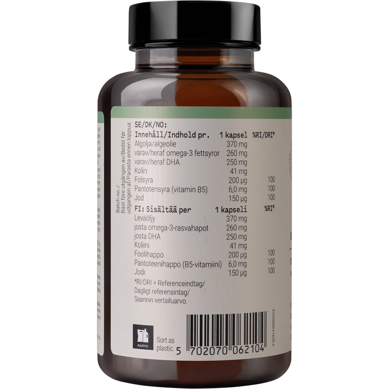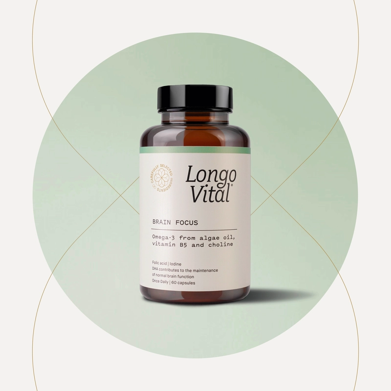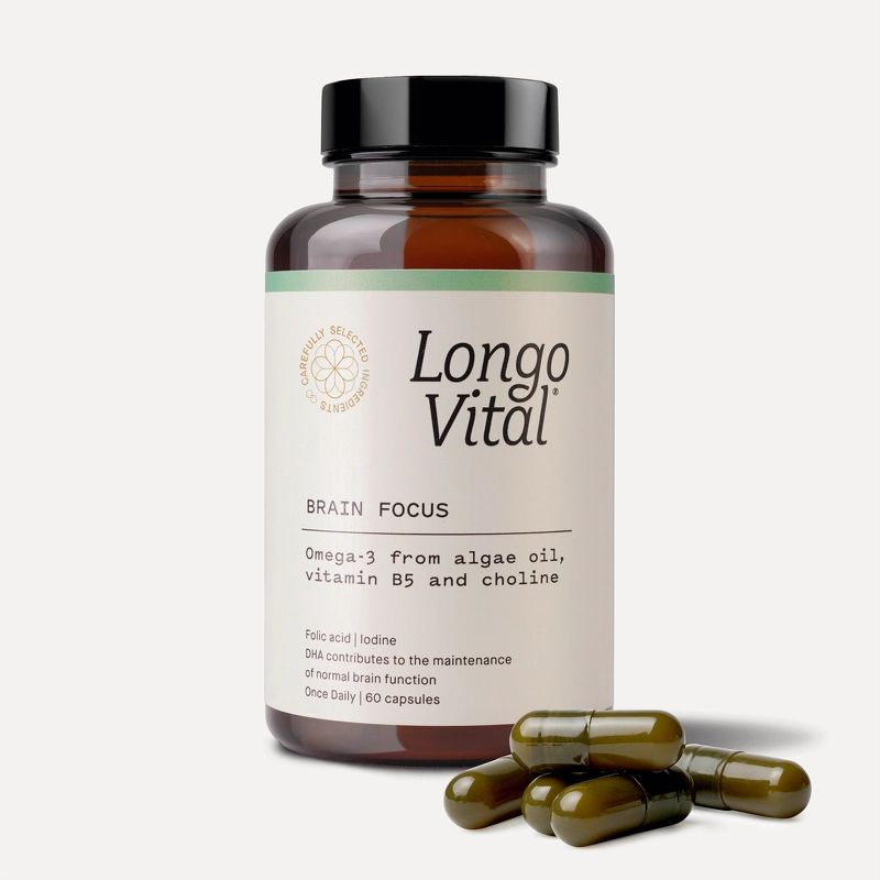 LongoVital Brain Focus ist ein Nahrungsergänzungsmittel für alle, die ihre normale Gehirnfunktion täglich unterstützen möchten. Es wurde nach einem ganzheitlichen Prinzip entwickelt und vereint zahlreiche Nährstoffe in einer umfassenden Formel. Die Kapseln basieren auf Omega-3-Fettsäuren aus Algenöl, kombiniert mit Vitamin B5, Cholin, Jod und Folsäure. DHA trägt zur Erhaltung einer normalen Gehirnfunktion bei (die positive Wirkung wird mit einer täglichen Einnahme von 250 mg erzielt). Jod trägt zu einer normalen kognitiven Funktion bei. Folsäure trägt zur Verringerung von Müdigkeit und Erschöpfung bei und unterstützt eine normale psychische Funktion. Pantothensäure hilft, die normale geistige Leistungsfähigkeit zu erhalten. Sie benötigen nur eine Kapsel täglich; eine Packung reicht für 60 Tage. Vorteile: - Nahrungsergänzungsmittel - Mit Omega-3-Fettsäuren aus Algenöl, Vitamin B5, Cholin, Jod und Folsäure - Unterstützt die normale Gehirnfunktion - Für Erwachsene ab 18 Jahren - Enthält 60 Kapseln Empfohlene Tagesdosis: - 1 Kapsel täglich für Erwachsene ab 18 Jahren - Muss unzerkaut geschluckt werden - Die empfohlene Tagesdosis darf nicht überschritten werden. Nährstoffgehalt pro Tagesdosis (1 Kapsel): - Algenöl 370 mg, davon - Omega-3-Fettsäuren 260 mg - DHA 250 mg - Cholin 41 mg - Folsäure 200 µg - Pantothensäure (Vitamin B5) 6 mg - Jod 150 µg HINWEIS: Die empfohlene Tagesdosis darf nicht überschritten werden. Nahrungsergänzungsmittel sind kein Ersatz für eine abwechslungsreiche Ernährung. Trocken und unter 25 °C lagern. Außerhalb der Reichweite von Kindern aufbewahren. Zutatenliste: Öl aus der Mikroalge Schizochytrium sp., Sonnenblumenöl, pflanzliche Kapsel (Hydroxypropylmethylcellulose), Füllstoff (Bienenwachs), Cholin-L-bitartrat, Pantothensäure, Antioxidationsmittel (Rosmarinextrakt), Farbstoff (Eisenoxide und Eisenhydroxide), Folsäure, Jod.