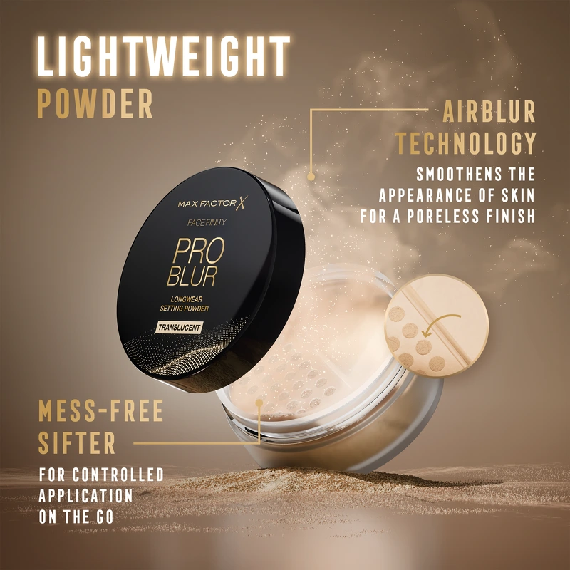 Max Factor Facefinity Pro Blur Loose Powder 3 Translucent ist ein hervorragendes loses Puder. Erzielen Sie mit Facefinity Pro Blur Loose Powder ein ebenmäßiges, seidiges Finish. Dieses kaschierende und fixierende Puder fühlt sich ultraleicht und schwerelos an und sorgt den ganzen Tag für ein perfektes Make-up. Die innovative Airblur-Technologie glättet die Hautstruktur, reduziert Glanz und minimiert sichtbare Poren. Das Ergebnis: ein ebenmäßiger und makelloser Teint – ohne sich schwer oder trocken anzufühlen. Das Puder befindet sich in einem praktischen Behälter mit integriertem Sieb, das die perfekte Menge jedes Mal abgibt und so ein einfaches und sparsames Auftragen ermöglicht. Wählen Sie aus drei Nuancen – Transparent, Rosy Silk oder Honey Hue – um je nach Bedarf zu fixieren, aufzuhellen oder zu neutralisieren. Ideal zum Baking, Fixieren oder für kleine Ausbesserungen – für einen stets makellosen, strahlenden und natürlich aussehenden Teint. Vorteile: - Loses Puder - Seidige, schwerelose Formel mit langem Halt - Die Airblur-Technologie glättet die Hautstruktur, reduziert Glanz und verfeinert die Poren - Praktischer Behälter mit Sieb für präzises Dosieren - Drei Nuancen: Transparent, Rosy Silk und Honey Hue - Geeignet zum Baking, Aufhellen und Fixieren Anwendung: - Zum Baking: Großzügig mit dem Puderquaste auftragen, 5 Minuten einwirken lassen, überschüssiges Puder abbürsten - Zum Fixieren/Blending: Mit dem Airblur-Pinsel auf die T-Zone und ölige Partien auftragen - Zum Aufhellen: Rosy Silk oder Honey Hue unter die Augen drücken, um sie aufzuhellen und Augenringe zu neutralisieren - Kann tagsüber zum Auffrischen verwendet werden - Die Menge je nach gewünschtem Effekt anpassen: leichtes Blending oder intensives Baking