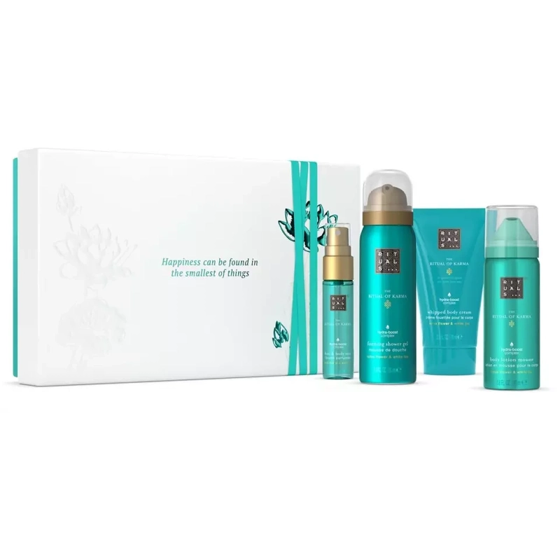 Das Rituals The Ritual Of Karma Small Gift Set ist eine wunderschöne Geschenkbox mit vier Produkten. Verwöhnen Sie Ihre Sinne mit diesem Set, das Ihren Körper mit dem sanften, sommerlichen Duft von Lotus und weißem Tee umhüllt. Das Ritual Of Karma Small Gift Set schenkt Ihnen Wohlbefinden und Luxus im Alltag, zu jeder Jahreszeit. Das Ritual of Karma Haar- und Körperspray ist ein leichtes, erfrischendes Duftspray, das Haut und Haar einen zarten, sommerlichen Duft nach Lotus und weißem Tee verleiht. Die Ritual of Karma Körpercreme ist eine reichhaltige, luxuriöse Creme, die die Haut intensiv mit Feuchtigkeit versorgt und sie seidig weich und gepflegt macht. Das Ritual of Karma Duschgel reinigt sanft und hinterlässt ein frisches, sauberes und duftendes Hautgefühl. Die Ritual of Karma Körperlotion-Mousse ist eine leichte, luftige Lotion, die schnell einzieht und intensive Feuchtigkeit spendet sowie die Haut weich und geschmeidig macht. Die elegante Geschenkbox rundet das Erlebnis ab und kann wiederverwendet werden, um kleine Schätze, Erinnerungen oder persönliche Gegenstände aufzubewahren – ein Geschenk, das verwöhnt und lange Freude bereitet. Perfekt als aufmerksames Geschenk oder als luxuriöser Genuss für sich selbst. Das Set enthält: – 1 x The Ritual of Karma Haar- und Körperspray 20 ml – 1 x The Ritual of Karma Körpercreme 70 ml – 1 x The Ritual of Karma Duschschaum 50 ml – 1 x The Ritual of Karma Körperlotion-Mousse 50 ml