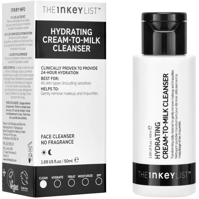 Der Inkey List Hydrating Cream to Milk Cleanser ist ein transformierendes Reinigungsprodukt für die tägliche Anwendung, das sanft Make-up und Unreinheiten entfernt. Die luxuriöse, zweiphasige Formel beginnt als samtige Creme und verwandelt sich bei Kontakt mit Wasser in eine weichmachende Milch, die Make-up, Sonnenschutz und Schmutz löst und entfernt. Die Haut bleibt sauber und gut mit Feuchtigkeit versorgt. Vorteile: - Gesichtsreiniger - Entfernt Make-up und Unreinheiten - Zwei-Phasen-Formel - Creme verwandelt sich bei Kontakt mit Wasser in weiche Milch - Löst und entfernt Make-up, Lichtschutzfaktor und Schmutz - Hinterlässt eine saubere und gut mit Feuchtigkeit versorgte Haut - Sanft zur Haut - Luxuriöse Konsistenz Anwendung: - Auf die trockene Haut auftragen - Sanft einmassieren - Mit Wasser in Milch verwandeln - Gründlich abspülen - Täglich anwenden Inhaltsstoffliste: Aqua (Wasser), Glycerin, Ethylhexylpalmitat, C12-15-Alkylbenzoat, PEG-6-Caprylic/Capric-Glyceride, Betain, Polyglyceryl-3-dicitrat/stearat, Natriumacrylat/Natriumacryloyldimethyltaurat-Copolymer, Isohexadecan, Pentylenglykol, Propandiol, Butyrospermum Parkii (Shea)-Butter, Hydroxyacetophenon, Oryza Sativa (Reisstärke), Caprylylglykol, Cetearyl Olivate, Polysorbat 80, Sorbitanolivat, Ethylhexylglycerin, Natriumhydroxid, Sorbitanoleat, Xanthangummi, hydrolysiertes Reisprotein, Oryza Sativa (Reis) Kleieöl, Inulin, Polyquaternium-10, hydrolysiertes Natriumhyaluronat, Natriumhyaluronat, Phenoxyethanol, Lecithin