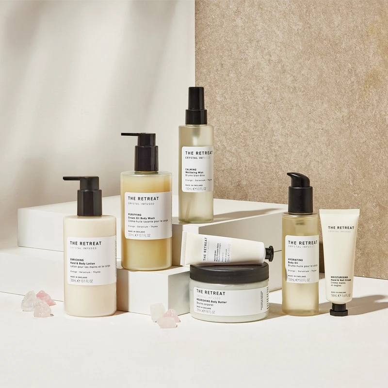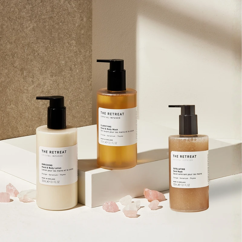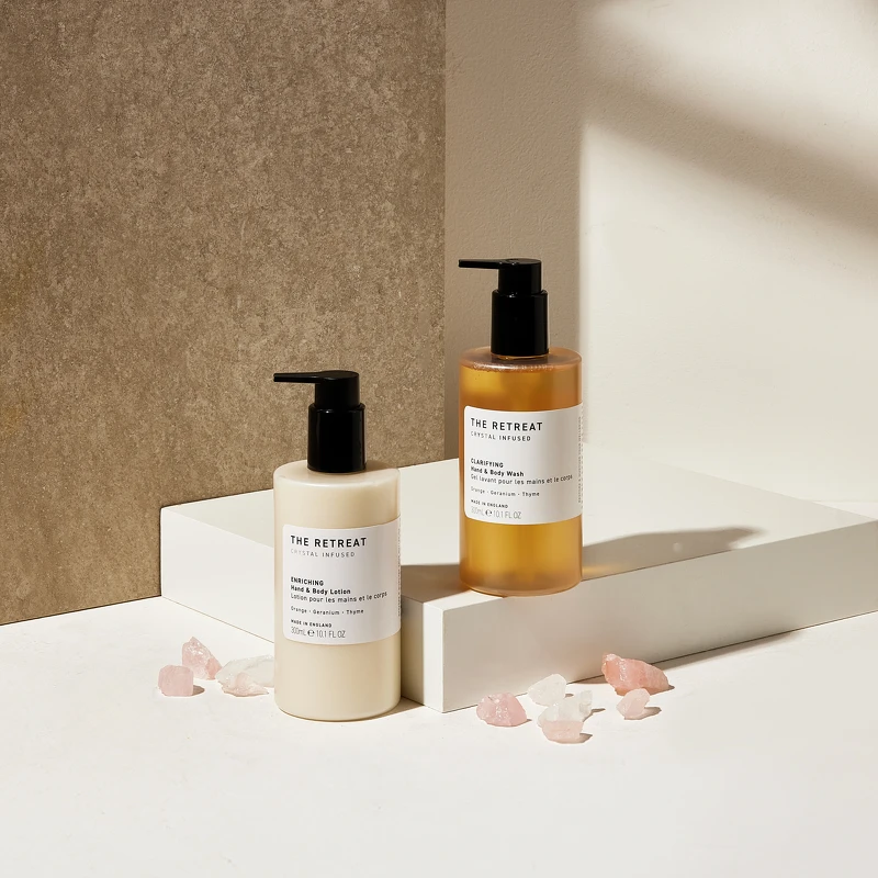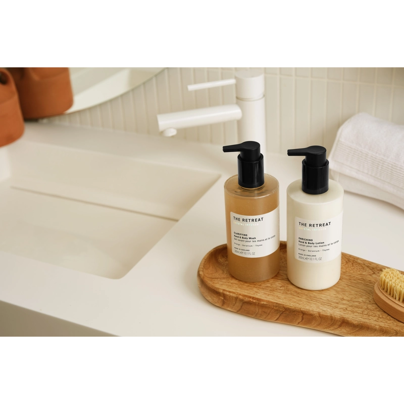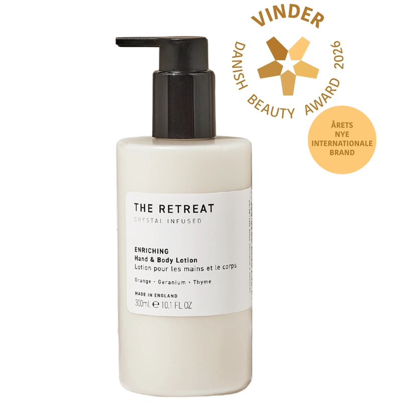 Die Retreat Enriching Hand & Body Lotion ist eine sinnliche Pflege, die Wohlbefinden und effektive Feuchtigkeitspflege vereint. Die leichte, schnell einziehende Formel mit 97 % natürlichen Inhaltsstoffen spendet bis zu 24 Stunden intensive Feuchtigkeit, ohne sich schwer auf der Haut anzufühlen. Der zarte Duft von Rose, kombiniert mit klarem Bergkristall, schafft eine beruhigende, fast spa-ähnliche Atmosphäre, während die Haut tiefenwirksam gepflegt wird. Wohltuende Kamille lindert Irritationen, Sheabutter macht die Haut seidig weich und Schwarzer-Hafer-Extrakt stärkt die natürliche Fähigkeit der Haut, ihren Feuchtigkeitshaushalt zu bewahren. Das Ergebnis ist geschmeidige, gepflegte Haut mit einem gesunden Glow – perfekt für den kleinen Luxusmoment im Alltag. Vorteile: - Hand- und Körperlotion für die tägliche Pflege - 97 % natürliche Formel - Leichte, schnell einziehende Textur - Spendet bis zu 24 Stunden Feuchtigkeit - Hilft, den Feuchtigkeitshaushalt der Haut zu bewahren - Macht die Haut weich und geschmeidig - Für Hände und Körper geeignet - Mit Rosenduft - Enthält eine Mischung aus Bergkristall Anwendung: - Auf die gereinigte, trockene Haut auftragen - Nach dem Baden oder Händewaschen verwenden - Einmassieren, bis die Lotion vollständig eingezogen ist - Täglich oder nach Bedarf anwenden - Für Hände und Körper geeignet Inhaltsstoffe: Aqua (Wasser), Glycerin, Cetylalkohol, Butyrospermum Parkii (Shea) Butter, Cetearylalkohol, Helianthus Annuus (Sonnenblumen) Samenöl, Ceteareth-20, Phenoxyethanol, Parfum (Duftstoff), Carbomer, Ethylhexylglycerin, Dinatrium-EDTA, Tocopherol, Sclerocarya Birrea (Marula) Samenöl, Hippophae Rhamnoides (Sanddorn) Fruchtöl, Kamille Kamillenblütenextrakt (Matricaria recutita), Hafersamenextrakt (Avena strigosa), Lecithin, Natriumhydroxid, Kaliumsorbat, Natriumbenzoat, Quarzpulver, Xanthan, Milchsäure, Zitronensäure, Linalool, Linalylacetat, Benzylalkohol, Citronellol, Limonen, Neroliöl (Citrus aurantium), Tetramethylacetyloctahydronaphthaline, Geraniol, Geranienöl (Pelargonium graveolens), Lavendelöl/-extrakt, Menthol, Pfefferminzöl (Mentha piperita), Kampfer, Eukalyptusöl (Eucalyptus globulus), Pinen, Beta-Caryophyllen, Grünes Minzöl (Mentha viridis), Carvon, Patchouliöl (Pogostemon cablin).