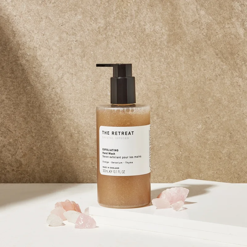 Die Retreat Peeling-Handseife duftet nach Orange, Geranie und Thymian. Sie reinigt, peelt und pflegt die Haut sanft. Die Seife besteht zu 90 % aus natürlichen Inhaltsstoffen. Fein gemahlener Bimsstein sorgt für ein sanftes, aber effektives Peeling. Aloe Vera und Kamillenextrakt sowie unsere 100 % natürliche Mischung aus 10 ätherischen Ölen und Rosen- und Bergkristallen beleben die Sinne und bringen die Haut ins Gleichgewicht. Geeignet für alle Hauttypen, vegan, dermatologisch getestet und Ecocert Greenlife-zertifiziert. Vorteile: - Peeling-Handseife mit effektiver Reinigung - Frischer Duft nach Orange, Geranie und Thymian - Hinterlässt eine saubere, weiche und geschmeidige Haut - Enthält 90 % natürliche Inhaltsstoffe - Für alle Hauttypen geeignet - Vegane Formel ohne tierische Inhaltsstoffe - Dermatologisch getestet - Ecocert Greenlife-zertifiziert - Pflege und Wohlbefinden vereint Anwendung: - Auf die feuchten Hände auftragen - Gründlich einmassieren und mit Wasser abspülen - Hände trocknen und anschließend die Feuchtigkeitsspendende Hand- und Nagelcreme auftragen Inhaltsstoffe: Aqua (Wasser), Sodium C14-16 Olefin Sulfonate, Glycerin, Acrylates Copolymer, Pumice, Sodium Coco-Sulfate, Phenoxyethanol, Parfum (Duftstoff), Pentylene Glycol, Propanediol, Caprylyl Glycol, Ethylhexylglycerin, Sodium Hydroxide, Polyquaternium-7, Aloe Barbadensis (Aloe Vera) Leaf Juice Powder, Caramel, Chamomilla Kamillenblütenextrakt, Natriumbenzoat, Inulin, Xanthangummi, Quarzpulver, Kaliumsorbat, Milchsäure, Lecithin, Linalool, Linalylacetat, Benzylalkohol, Citronellol, Limonen, Neroliöl, Tetramethylacetyloctahydronaphthaline, Geraniol, Geranienöl, Lavendelöl/-extrakt, Menthol, Pfefferminzöl