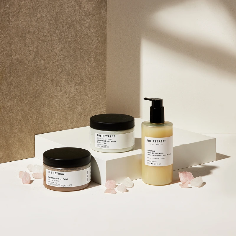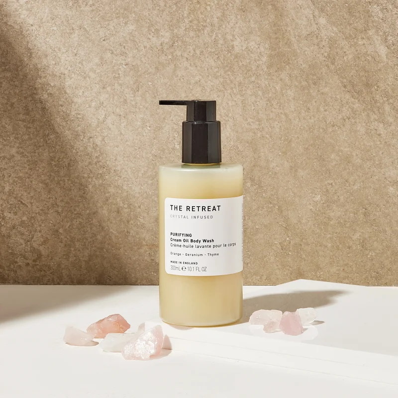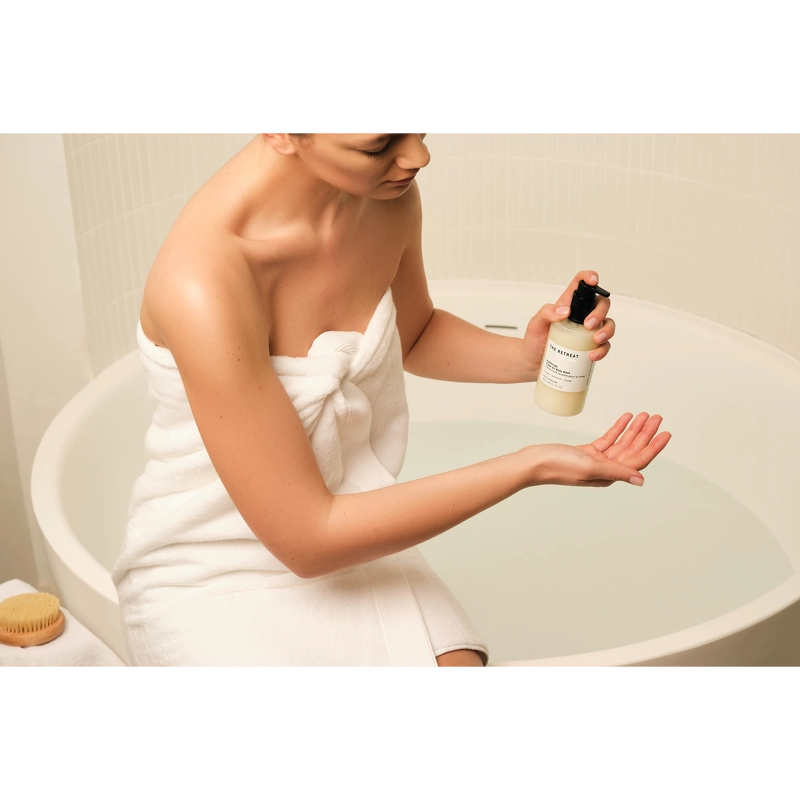 Das Retreat Purifying Cream Oil Body Wash ist ein Badeöl, das zarte Rosennoten mit einer einzigartigen Mischung aus klarem Quarz vereint und Ihrer täglichen Pflegeroutine einen Hauch von Eleganz verleiht. Die seidige Formel verwandelt sich bei Kontakt mit Wasser in eine cremige Konsistenz, die die Haut sanft reinigt und sie spürbar weich und gepflegt hinterlässt. Mit 98 % Inhaltsstoffen natürlichen Ursprungs ist es angereichert mit beruhigender Kamille und feuchtigkeitsbindendem Glycerin, die das natürliche Gleichgewicht der Haut bewahren. Das Ergebnis ist gepflegte Haut mit einem angenehm frischen Gefühl – jedes Mal nach dem Baden. Vorteile: - Duschgel - Mit Rosen- und Bergkristallmischung - Macht die Haut weich und spendet Feuchtigkeit - Luxuriöse Textur - Verwandelt sich bei Kontakt mit Wasser in eine cremige Konsistenz - 98 % natürliche Formel