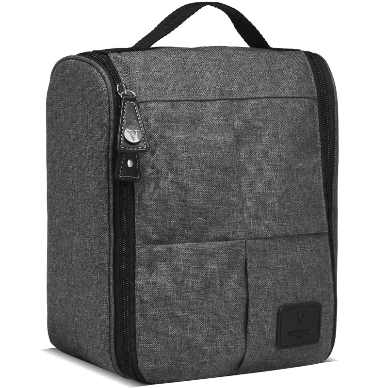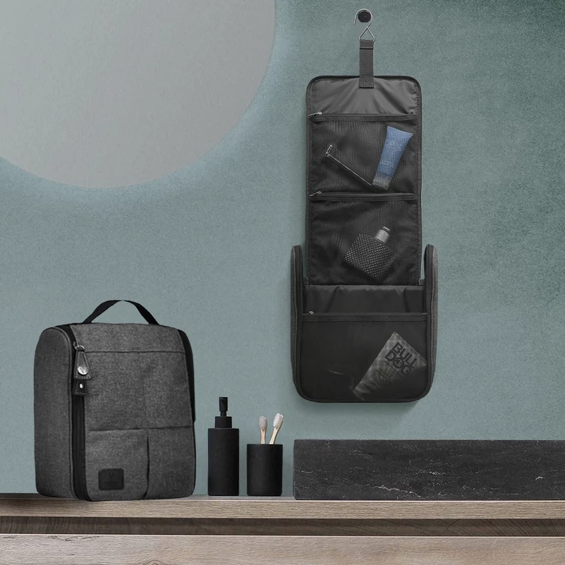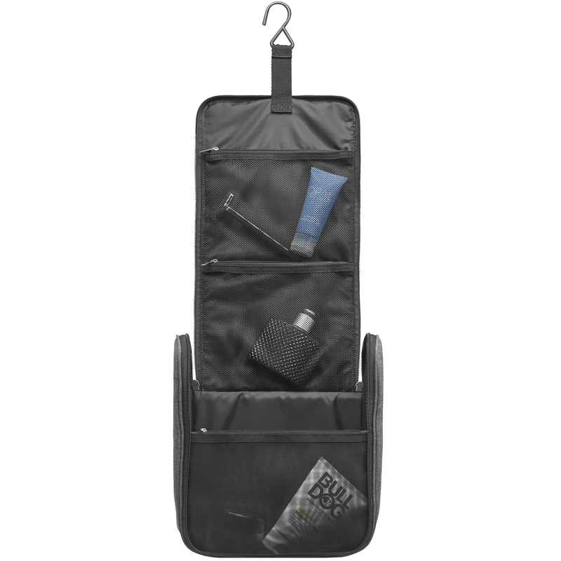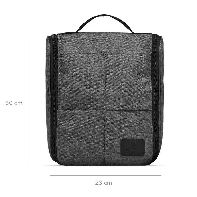 Vittorio Hang Up Bag Men - Grey 11027-BA ist ein cleverer Kulturbeutel zum Aufhängen aus 100 % recyceltem Kunststoff, der die perfekte Wahl für alle ist, die eine praktische und umweltfreundliche Lösung zur Aufbewahrung ihrer Toilettenartikel suchen. Mit ihrem klassischen Design und dem cleveren Haken kann die Tasche im Badezimmer aufgehängt werden, sodass Sie immer einen guten Überblick über Ihre Produkte behalten. Die beiden großen Netztaschen mit Reißverschlüssen im Deckel und die Innentasche bieten Ihnen viel Platz zum Organisieren Ihrer Toilettenartikel, während in dem großen Fach alles von Shampooflaschen bis Rasierschaum Platz findet. Der Kulturbeutel ist nicht nur praktisch, sondern auch leicht zu reinigen. Er kann bei 30 Grad in der Maschine gewaschen und bei niedriger Temperatur getrocknet werden, sodass er immer frisch und sauber bleibt. Mit den Abmessungen L23 x H30 x B10 cm ist dieser Kulturbeutel der perfekte Begleiter für Reisen und den täglichen Gebrauch. Details: - Kulturbeutel - Für Männer - Hat ein großes Fach mit Reißverschluss - 1 offene Netztasche und 2 mit Reißverschluss innen - Integrierter Haken zum Aufhängen der Tasche - Funktionelle und organisierte Aufbewahrung - Hergestellt aus 100 % recyceltem Kunststoff - Maße: H: 30 cm B: 23 cm T: 11 cm
