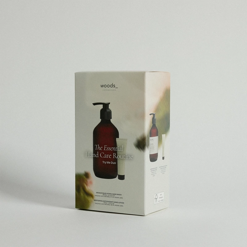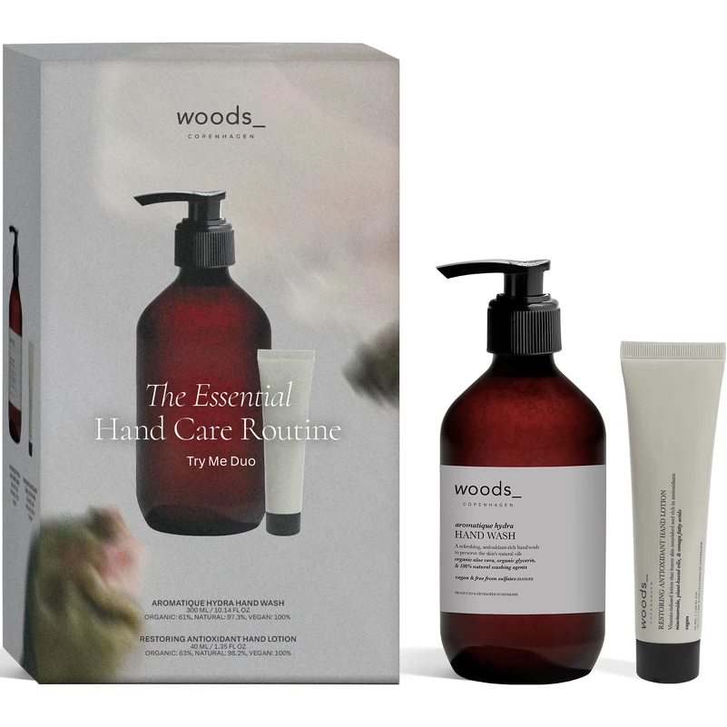 Woods_Copenhagen The Essential Hand Care Routine – Try Me Duo Geschenkset ist eine Geschenkbox mit flüssiger Handseife und Handlotion, die beanspruchten Händen die Pflege gibt, die sie verdienen. Dieses Set verwöhnt die Hände mit der ultimativen Pflege, bestehend aus aktiven, natürlichen und biologischen Inhaltsstoffen. Die Handseife Aromatique Hydra Hand Wash reinigt die Haut effektiv, aber sanft mit 100 % natürlichen Waschwirkstoffen, die den natürlichen Feuchtigkeitshaushalt und das Mikrobiom (Ökosystem) der Haut bewahren. Die seidige Textur und der angenehme Duft hinterlassen saubere Hände, ohne sie auszutrocknen, während Bio-Aloe Vera dank Antioxidantien, Vitaminen und Enzymen eine schützende Barriere bildet. Bio-Glycerin bindet Feuchtigkeit tief in den Hautschichten und stärkt die Hautschutzbarriere. Die Handseife ist daher viel mehr als ein einfaches Reinigungsmittel – sie stärkt die Haut mit jedem Pumpstoß mit aktiver Pflege. Anschließend spendet die Restoring Antioxidant Hand Lotion intensive, aber schnell einziehende Feuchtigkeit, die die pflegenden Inhaltsstoffe in der Haut einschließt. Niacinamid – auch bekannt als Vitamin B3 – trägt zu einem ebenmäßigeren Hautton bei und verbessert die Hautelastizität und Barrierefunktion. Die pflegende Basis aus pflanzlichen Ölen, reich an Antioxidantien und essentiellen Fettsäuren, wirkt harmonisch mit pflegenden Omega-Fettsäuren zusammen, um die Haut zu beruhigen und zu stärken – und hilft Ihnen so, trockene, empfindliche und geschädigte Haut zu vermeiden. Beide Produkte enthalten einen frischen Duft nach natürlicher Zitrone, Iris und Rose. Verschenken Sie die Box als schönes Gastgeschenk für eine festliche Zusammenkunft oder gönnen Sie sich und Ihren Händen hochwertige Pflege. Die Box enthält: - 1 Stk. Woods_Copenhagen Aromatique Hydra Hand Wash 300 ml - 1 Stk. Woods_Copenhagen Restoring Antioxidant Hand Lotion 40 ml (Limited Edition)