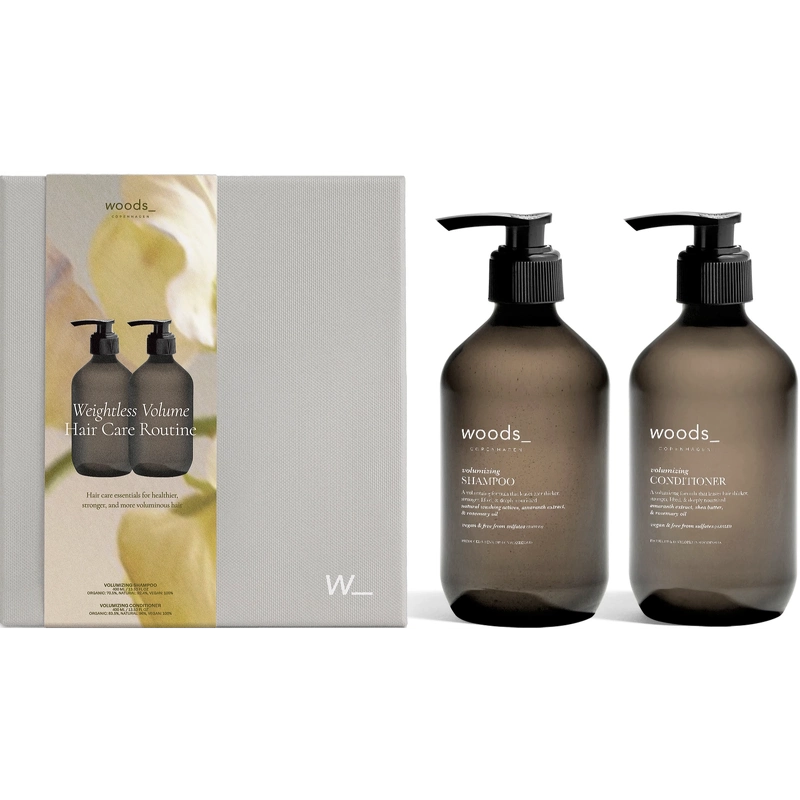 Das Woods_Copenhagen Weightless Volume - Hair Care Routine Geschenkset ist eine fantastische Geschenkbox mit Volumenshampoo und -spülung für feines und plattes Haar. Volumenshampoo und Volumenspülung wirken perfekt zusammen und verleihen Ihrem Haar pflegende, stärkende und schützende Eigenschaften, die Trockenheit, Schuppen und Spliss effektiv vorbeugen. Das Geschenkset ist besonders für feines und normales Haar geeignet. Volumenshampoo wäscht das Haar mit natürlichen, sanften und volumengebenden Inhaltsstoffen wie Rosmarinöl, das die Durchblutung der Kopfhaut effektiv anregt und das Wachstum gesunder, kräftiger Haarsträhnen fördert. Amaranth-Extrakt enthält das natürliche Öl Squalen und Lipide, die den Feuchtigkeitsgehalt der Haut erhöhen und erhalten – für ein geschmeidiges Ergebnis. Dank natürlicher Waschwirkstoffe werden Haar und Kopfhaut effektiv gewaschen, ohne das natürliche Gleichgewicht der Kopfhaut zu stören – das wirkt Schuppen und Juckreiz entgegen. Volumenspülung verwandelt feines Haar dank pflegender Inhaltsstoffe, die das Haar vom Ansatz bis in die Spitzen pflegen, in voluminöse Locken. Amaranth-Extrakt bindet Feuchtigkeit, während Sheabutter dank ihres hohen Gehalts an Fettsäuren und Nährstoffen das Haar weich und geschützt hält. Das Haar wird weich, voll und glänzend mit einem frischen, aromatischen Duft von Rose, Zitrus und Freesie. Ein ideales Geschenkset für alle, die hochwertige Haarpflege verdienen. Die Box enthält: - 1 Stk. Woods_Copenhagen Volumizing Shampoo 400 ml - 1 Stk. Woods_Copenhagen Volumizing Conditioner 400 ml