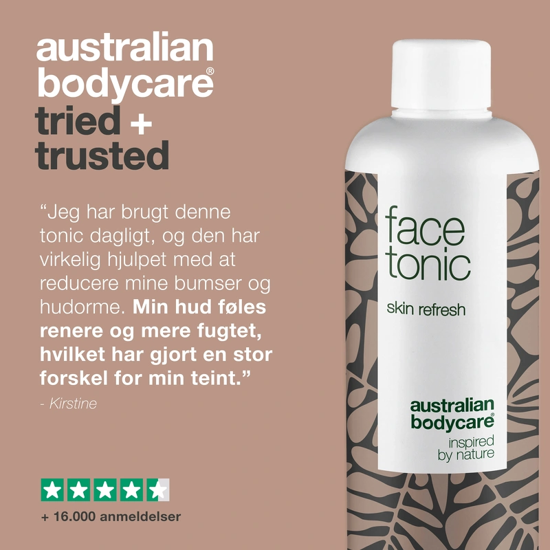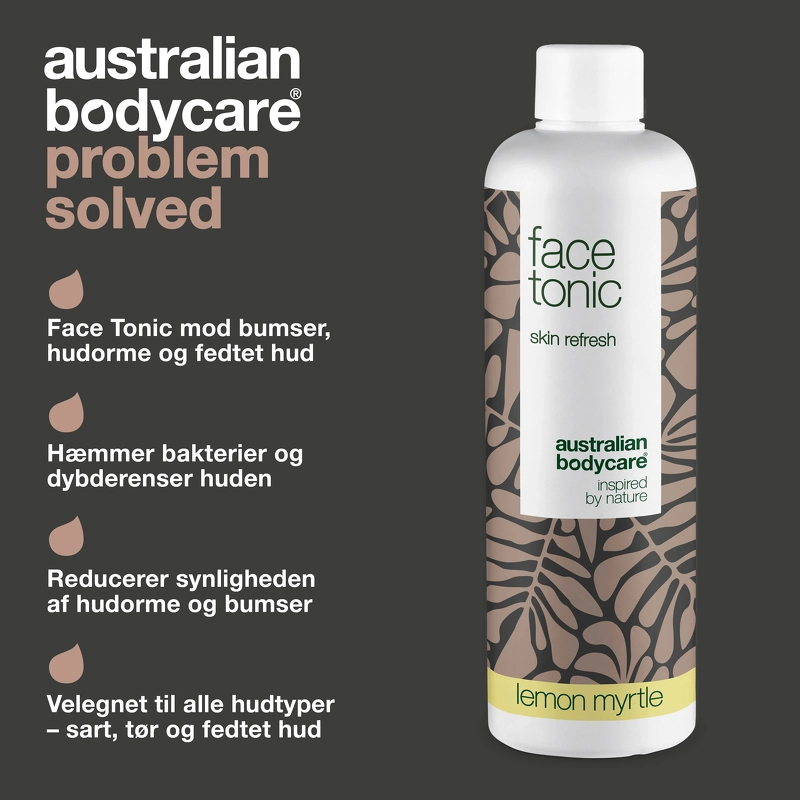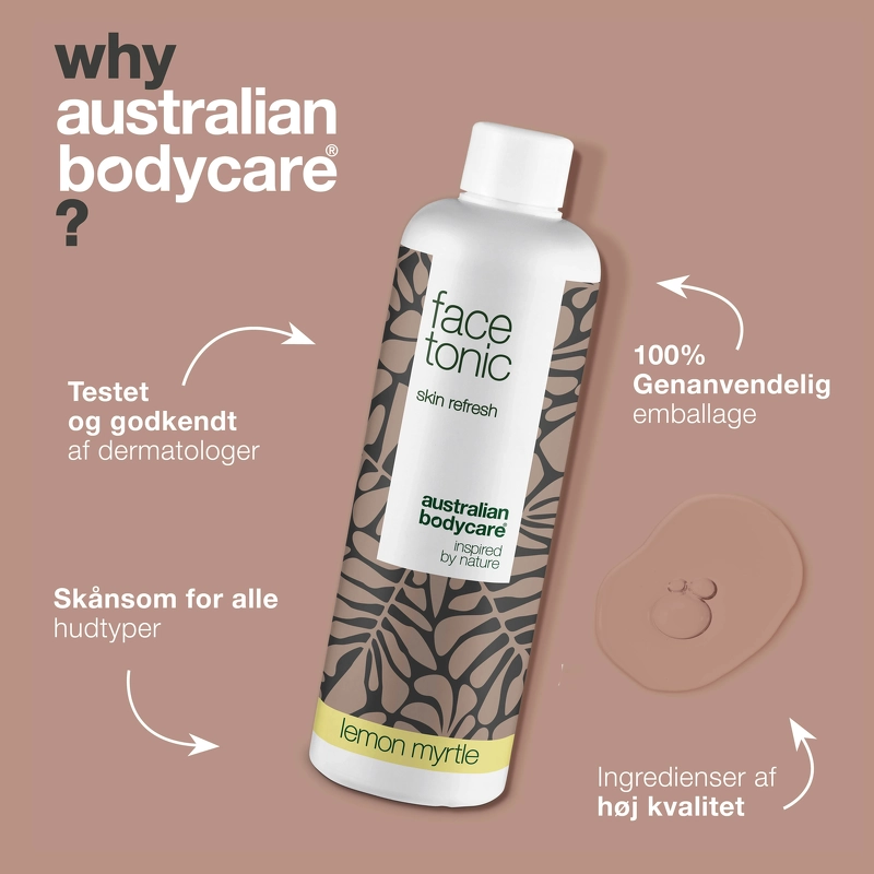 Australian Bodycare Face Tonic Lemon Myrtle is een alcoholvrije huidtonic die de huid en poriën diep reinigt en mee-eters, puistjes en een onzuivere huid helpt tegengaan en voorkomen, maar geschikt is voor alle huidtypes – zelfs de droge huid. Het is verrijkt met antibacteriële Tea Tree Oil, die helpt voorkomen dat bacteriën zich in de huid en poriën nestelen, terwijl kokosolie en glycerine vocht vasthouden. Aloë vera en allantoïne helpen de geïrriteerde en beschadigde huid te kalmeren en te genezen, net zoals extract uit de antioxidantrijke kakadu-pruim een beschermend effect op de huid heeft. Face Tonic heeft geen uitdrogende werking op de huid en is dermatologisch getest, waardoor je het product zonder problemen kunt gebruiken als je een gevoelige of gevoelige huid hebt. Je kunt baat hebben bij skin tonic, ongeacht of je last hebt van een vette huid, een droge huid of simpelweg onzuiverheden op je gezicht wilt voorkomen. Aan deze variant is ook citroenmirte toegevoegd, wat een heerlijke, verfrissende citrusgeur geeft, maar ook veel gunstige eigenschappen heeft. Het helpt onder meer een gezonde huid te stimuleren, net zoals het ook bijdraagt aan de hydraterende en antibacteriële werking. Voordelen: - Skintonic - Reinigt de huid en poriën diep - Gaat mee-eters, puistjes en onzuivere huid tegen - Hydraterend - Gaat bacteriën tegen - Kalmeert en geneest geïrriteerde en beschadigde huid - Ideaal voor de vette en onzuivere huid - Voor alle huidtypes, ook droge en gevoelige huid - Alcoholvrij - Dermatologisch getest - Vegan Gebruik: - Gebruik op een gereinigde huid - Doe de toner op een wattenschijfje en breng deze aan over gezicht en hals - Werk af met een dag- of nachtcrème - Gebruik 's ochtends en 's avonds Ingrediëntenlijst:** Aqua/Water, PEG-40 gehydrogeneerde ricinusolie, PEG-7 glycerylcocoaat, glycerine, triethylcitraat, fenoxyethanol, saccharide-isomeraat, Melaleuca Alternifolia (tea tree) bladolie, natrium PCA, Allantoïne, Kaliumsorbaat, Natriumbenzoaat, Melkzuur, Backhousia Citriodora (Citroenmirte) Bladolie, Citral, Tocoferol, Terminalia Ferdinandiana (Kakadu Pruim) Fruitextract, Limoneen, Citroenzuur, Natriumcitraat, Geraniol