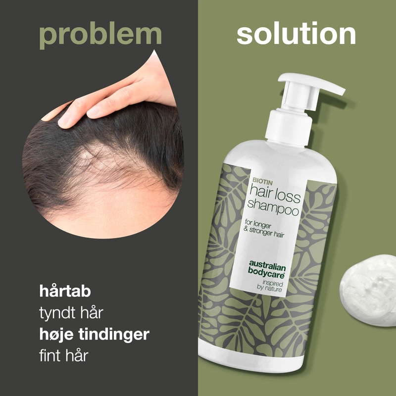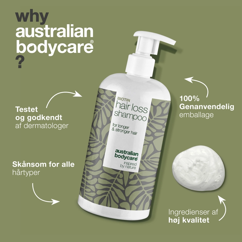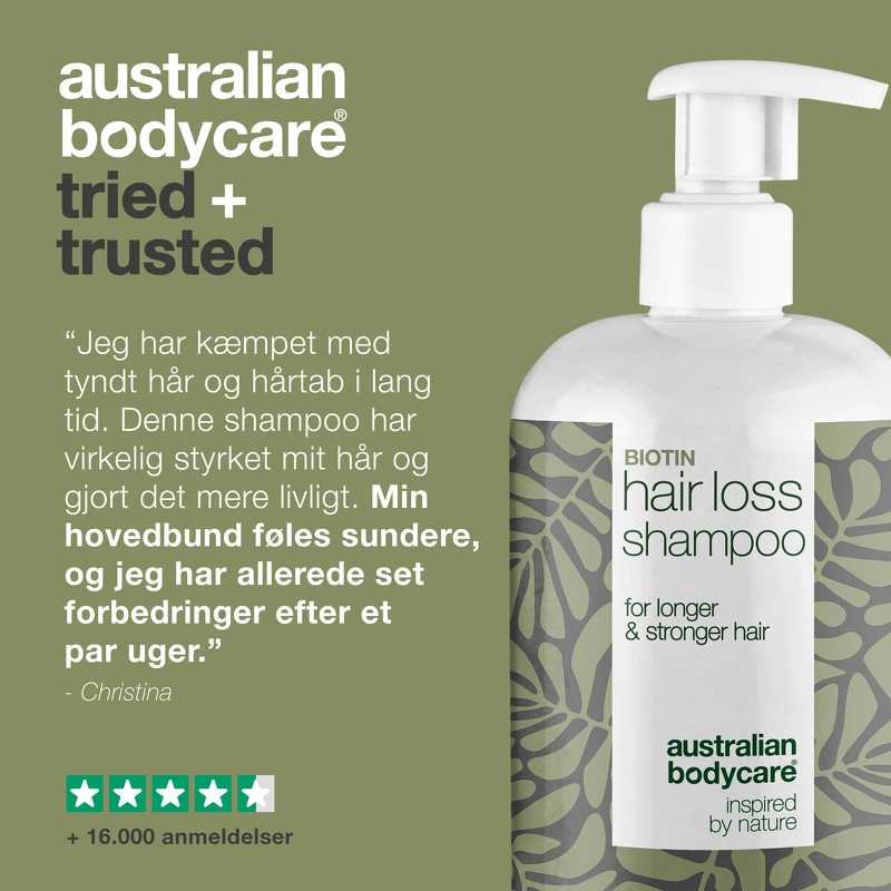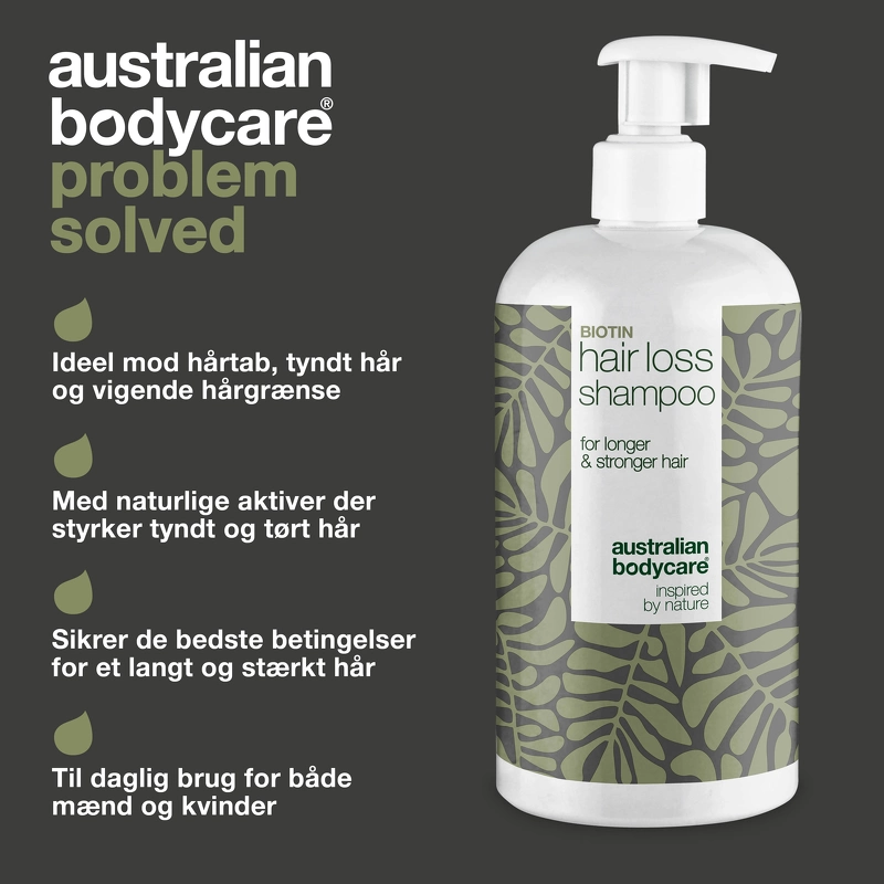 Australian Bodycare Hair Loss Wash is een stimulerende shampoo voor u die last heeft van haaruitval of heel dun en fijn haar heeft. Het is verrijkt met een unieke combinatie van ingrediënten die verlevendigend en versterkend op je haar werken en tegelijkertijd de bloedsomloop in de hoofdhuid verbeteren. Dit helpt om de meest optimale groeiomstandigheden te bieden om mooi, gezond haar te laten groeien. Australian Bodycare Hair Loss Wash bevat de natuurlijk actieve Capilia Longa en Biotine, die bewezen effectief zijn tegen haaruitval. Het is ook toegevoegd met natuurlijke Tea Tree Olie, die bacteriën tegengaat en een gezondere hoofdhuid bevordert, waardoor het haar dikker en sterker wordt. Tegelijkertijd zorgt het amarantextract ervoor dat zowel het haar als de hoofdhuid goed gehydrateerd worden. Australian Bodycare raadt u aan Australian Bodycare Hair Loss Wash te gebruiken in combinatie met een minimum aan serum, conditioner en eventuele spray uit de [Hair Loss series](https://nicehair.dk/search?text=Australian%20Bodycare%20Hair%20Loss ) en dat ze allemaal regelmatig worden gebruikt om het beste resultaat te bereiken. Wanneer u resultaat kunt verwachten, hangt van veel verschillende factoren af, maar de meeste mensen zullen resultaten na 12-20 weken beginnen te zien. Daarom moet u zich met een flinke dosis geduld bewapenen en het gebruik ook voortzetten nadat de eerste resultaten zijn verschenen, om het grootst mogelijke succes te behalen. Voordelen: - Shampoo - Voorkomt haaruitval - Revitaliserend en versterkend - Stimuleert en bevordert een gezondere hoofdhuid - Geeft het haar optimale groeicondities - Hydrateert haar en hoofdhuid - Verrijkt met tea tree olie, capilia longa en biotine - Veganistisch - XL maat Toepassing: - In nat haar masseren - 2-3 minuten laten inwerken - Uitspoelen - Aanbevolen om te gebruiken in combinatie met Hair Loss Conditioner, Hair Loss Serum en eventueel Haaruitvalspray Ingrediëntenlijst:** Aqua/water, natriumlaurethsulfaat, glycerine, cocamidopropylbetaïne, PEG-7 glycerylcocoaat, glycoldistearaat, melaleuca alternifolia (theeboom) bladolie, PEG-4 koolzaadamide, fenoxyethanol, dinatriumcocoamphodiacetaat , Citroenzuur, natriumbenzoaat, kaliumsorbaat, coco-glucoside, guarhydroxypropyltrimoniumchloride, gehydrogeneerde ricinusolie, tocoferol, tetranatriumiminodisuccinaat, glyceryloleaat, curcuma longa (kurkuma) eeltgeconditioneerde media, natrium PCA, amaranthus caudatus zaadextract, natriumlactaat, Biotine, arginine, asparaginezuur, PCA, benzoëzuur, glycine, alanine, serine, valine, isoleucine, proline, threonine, gluconolacton, natriumhydroxide, histidine, fenylalanine, calciumgluconaat, natriumchloride, limoneen.