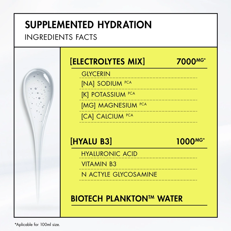 Biotherm Aquasource+ Electrolytes Skin-Drink is een lichte gelformule die tot 100 uur hydratatie biedt na slechts één applicatie*. De lichte gel bevat 7000 mg elektrolytenmix, waarvan bekend is dat het de hydratatie in sportdranken en supplementen optimaliseert, en 1000 mg hyaluronzuur B3. De formule helpt fijne lijntjes in slechts 1 uur te verminderen en ondersteunt de vochtreserves van de huid na verloop van tijd. Cosmetisch klinische studies, instrumentele tests en consumentenenquêtes tonen zichtbare verbeteringen in de huidtextuur, de volheid en 100 uur langdurige hydratatie na slechts één applicatie. -Instrumentele test bij 24 proefpersonen. -Van toepassing op 100 ml. -*Cosmetisch klinisch resultaat bij 40 proefpersonen. Voordelen:* - Biotherm Aquasource+ Electrolytes Skin-Drink - Lichte gelformule - Biedt tot 100 uur hydratatie na één applicatie - Bevat 7000 mg elektrolytenmix - Optimaliseert vochtopname - Bevat 1000 mg Hyalu B3 - Vermindert fijne lijntjes in 1 uur** - Verbetert de vochtreserves van de huid na verloop van tijd - Zichtbare verbeteringen in huidtextuur en volume - 100 uur langdurige hydratatie na één applicatie* Toepassing: - Breng Aquasource+ Electrolyte Dewy Gel 100H elke ochtend en/of avond aan op een schone huid, vóór of in plaats van uw gebruikelijke moisturizer - Knijp een kleine hoeveelheid in uw handpalm - Dep zachtjes op gezicht en hals, vermijd de huid rond de ogen - Druk zachtjes met uw vingertoppen op uw voorhoofd en wangen om de absorptie van de lichte geltextuur te bevorderen Ingrediëntenlijst: - 863755 40 - INGREDIËNTEN: AQUA / WATER / EAU, GLYCERINE, PENTYLEENGLYCOL, PEG-20, KALIUM-PCA, CARBOMER, NIACINAMIDE, CALCIUM-PCA, PPG-6-DECYLTETRADECETH-30, NATRIUMHYALURONAAT, NATRIUMHYDROXIDE, NATRIUM-PCA, ADENOSINE, MAGNESIUM-PCA, CAPRYLYLGLYCOL, VITREOSCILLAFIREMENT, TRINATRIUMETHYLEENDIAMINEDISUCCINAAT, ACETYLGLUCOSAMINE, ETHYLHEXYLGLYCERINE, TOCOPHEROL, LIMONEEN, CITRAL, CITRUS AURANTIUM SCHILOLIE, CITRUS LIMON SCHILOLIE, CARVONE, PARFUM / GEUR (BESTAND N70063628/1).