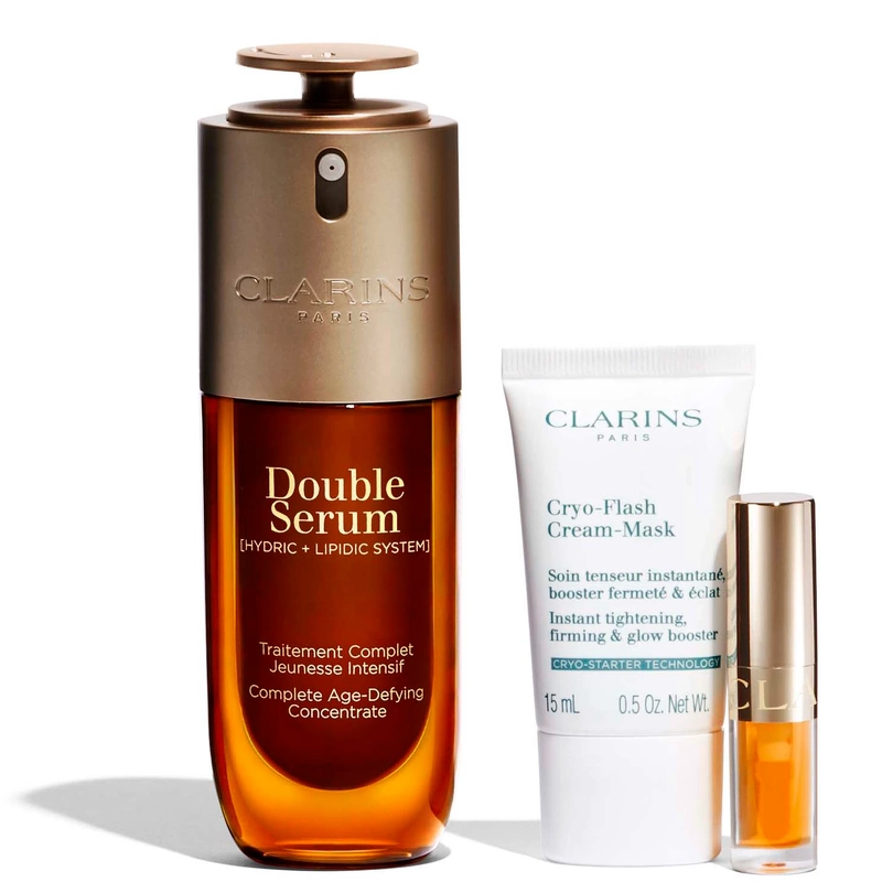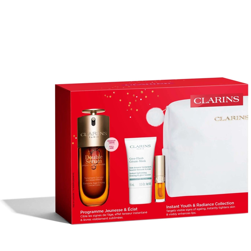 Clarins Double Serum Xmas Kit 2025 is een set die snel een onmisbaar onderdeel zal worden van je dagelijkse anti-aging en glow routine om een vermoeide of doffe huid nieuw leven in te blazen. De iconische nieuwe generatie Double Serum pakt verschillende tekenen van veroudering aan. Het resultaat? Zichtbaar gladde rimpels en een stevigere, vollere en stralendere huid. Voor een verkoelend en verstevigend effect verlaagt het Cryo-Flash Cream-Mask de huidtemperatuur met -4°C^. De huid is direct steviger en stralender na elke applicatie. Eindig met de iconische Lip Comfort Oil voor glanzende, volle lippen die de hele dag gehydrateerd blijven. Een mooi zakje gemaakt van 87% gerecyclede vezels bewaart alle producten. De recyclebare doos is gedrukt op papier afkomstig uit duurzaam beheerde bossen. ^Klinische test uitgevoerd door het gemiddelde te nemen van de resultaten verkregen met drie bestverkochte cryotherapie-instrumenten in Frankrijk, gemiddelde temperatuur na 10 minuten applicatie, op 60 vrijwilligers. De set bevat: - 1 st. Clarins DOUBLE SERUM 50 ml - 1 stuk. Clarins Cryo Mask 15 - 1 stuk. Clarins Lip Comfort Oil 5 ml - 01 Honey
