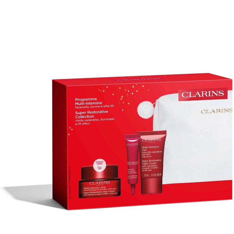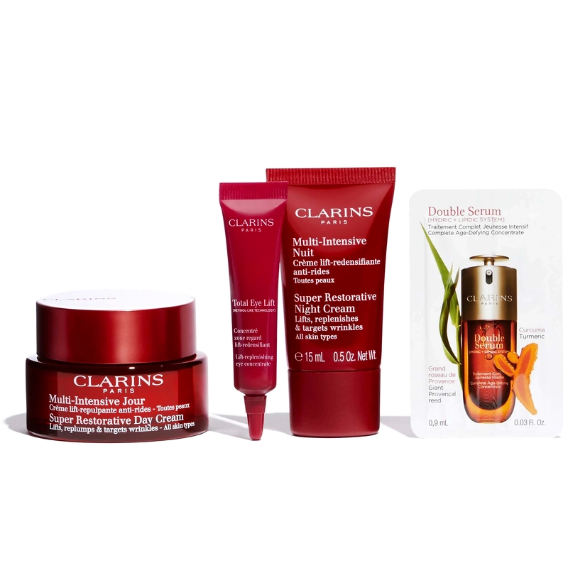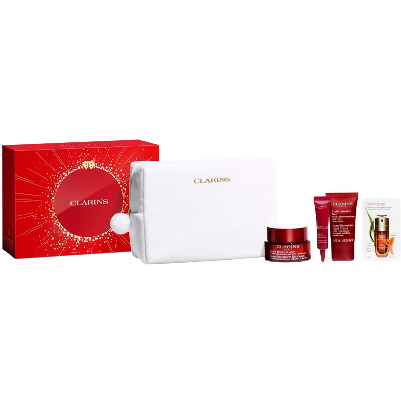 Clarins Super Restorative Xmas Kit 2025 is een set herstellende huidverzorgingsproducten, ontwikkeld voor de huid die last heeft van hormonale veranderingen die verband houden met leeftijd: Ontdek de herstellende Super Restorative Dagcrème met harungana-extract. De huid van het gezicht voelt voller aan, gezichtscontouren lijken meer gedefinieerd en rimpels worden zichtbaar gladgestreken. Voor een complete routine geeft de Super Restorative Night de huid 's ochtends een stralende gloed. Voor de oogcontour helpt de nieuwe Total Eye Lift de oogcontour glad te strijken en op te vullen. Voor een complete, jeugdversterkende behandeling pakt het iconische, onmisbare Double Serum van de nieuwe generatie alle tekenen van veroudering aan: rimpels worden zichtbaar gladgestreken en de huid wordt steviger, voller en stralender. Zelfs de huidtextuur wordt zichtbaar verbeterd en verfijnd, met poriën die er kleiner uitzien. Een mooi zakje, gemaakt van 87% gerecyclede vezels, bewaart alle producten. De recyclebare doos is gedrukt op papier uit duurzaam beheerde bossen. De geschenkdoos bevat: - 1 st. Clarins Super Restorative Dagcrème 50 ml - Alle huidtypen - 1 st. Clarins Eye Total Eye Lift 7 ml - 1 st. Clarins Super Restorative Nachtcrème 15 ml - Alle huidtypen - 1 st. Clarins DOUBLE SERUM 0,9 ml](https://nicehair.dk/clarins-double-serum-alle-huidtypen-75-mln.html)