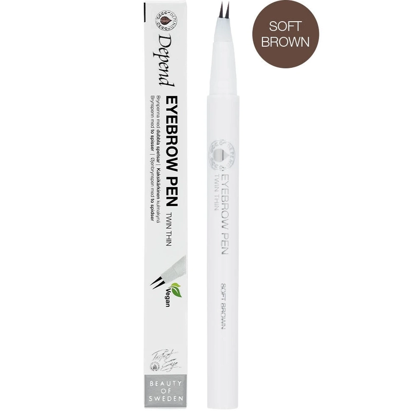 Depend Cosmetic PE Eyebrow Pen Twin Thin - Soft Brown is een slimme wenkbrauwpen met twee punten die snel en eenvoudig een haarachtig effect geeft met natuurlijk mooie lijntjes. Met deze pen teken je met lichte hand en veerkrachtige bewegingen het aantal haartjes dat je aan je bestaande wenkbrauwen wilt toevoegen. De hoek van de punten zorgt voor een ergonomische, stabiele applicatie en een gelijkmatige pigmentatie. Vul je wenkbrauwen in en definieer ze, of vul ze aan met reeds gestylede wenkbrauwen. Gebruik deze pen voor het snel en eenvoudig stylen van je wenkbrauwen - het wordt ongetwijfeld je nieuwe go-to product voor prachtige wenkbrauwen! Voordelen: - Wenkbrauwpotlood - Met 2 punten - Haarachtig effect - Natuurlijk mooie lijnen - Vult, definieert of complementeert reeds gestylde wenkbrauwen - Egale pigmentatie - Ergonomisch, stabiel aan te brengen - Veganistisch Toepassing: - Borstel door de wenkbrauwen - Teken haarachtige borstelharen met lichte hand en veerkrachtige bewegingen in dezelfde richting als de natuurlijke haartjes - Vul de gebieden met ontbrekende haartjes in voor meer volume - Werk af met wenkbrauwgel of wenkbrauwmascara voor extra volume en fixatie - Als u Brow Lift Illusion Styling Wax gebruikt: Breng eerst Brow Lift Illusion Wax aan en laat het drogen. Gebruik vervolgens Twin Thin om de haartjes te tekenen waarmee u uw wenkbrauwstyling wilt aanvullen. Kan eenvoudig worden verwijderd met warm water. Ingrediëntenlijst: Aqua, Styreen/Acrylaten/Copolymeer, Butyleenglycol, Polyacrylzuur, 1,2-Hexanediol, Caprylylglycol, Fenoxyethanol, Aminomethylpropanol, Propyleenglycol, Citroenzuur, Propaandiol, Benzylalcohol, Xanthaangom, Caprylhydroxaminezuur, +/-, CI 19140, CI 17200, CI 42090.