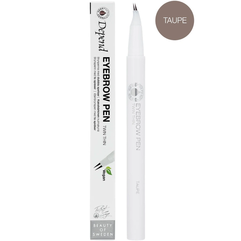 Depend Cosmetic PE Wenkbrauwpen Twin Thin 0,55 gr. - Taupe is een slimme wenkbrauwpen met twee punten die snel en eenvoudig een haarachtig effect geeft met natuurlijk mooie lijnen. Met deze pen teken je met lichte hand en veerkrachtige bewegingen het aantal haartjes dat je aan je bestaande wenkbrauwen wilt toevoegen. De hoek van de punten zorgt voor een ergonomische, stabiele applicatie en een gelijkmatige pigmentatie. Vul je wenkbrauwen in en definieer ze, of vul ze aan met reeds gestylede wenkbrauwen. Gebruik deze pen voor het snel en eenvoudig stylen van je wenkbrauwen - het wordt ongetwijfeld je nieuwe go-to product voor prachtige wenkbrauwen! Voordelen: - Wenkbrauwpotlood - Met 2 punten - Haarachtig effect - Natuurlijk mooie lijnen - Vult, definieert of complementeert reeds gestylde wenkbrauwen - Egale pigmentatie - Ergonomisch, stabiel aan te brengen - Veganistisch Toepassing: - Borstel door de wenkbrauwen - Teken haarachtige borstelharen met lichte hand en veerkrachtige bewegingen in dezelfde richting als de natuurlijke haartjes - Vul de gebieden met ontbrekende haartjes in voor meer volume - Werk af met wenkbrauwgel of wenkbrauwmascara voor extra volume en fixatie - Als u Brow Lift Illusion Styling Wax gebruikt: Breng eerst Brow Lift Illusion Wax aan en laat het drogen. Gebruik vervolgens Twin Thin om de haartjes te tekenen waarmee u uw wenkbrauwstyling wilt aanvullen. Kan eenvoudig worden verwijderd met warm water. Ingrediëntenlijst: Aqua, Styreen/Acrylaten/Copolymeer, Butyleenglycol, Polyacrylzuur, 1,2-Hexanediol, Caprylylglycol, Fenoxyethanol, Aminomethylpropanol, Propyleenglycol, Citroenzuur, Propaandiol, Benzylalcohol, Xanthaangom, Caprylhydroxaminezuur, +/-, CI 19140, CI 17200, CI 42090.