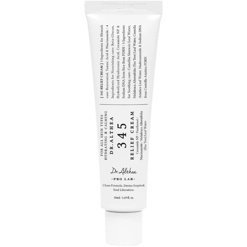 Dr. Althea 345 Relief Cream is een multifunctionele crème die de huid hydrateert, kalmeert en beschermt. De veganistische formule is verrijkt met Melaleuca Alternifolia (Tea Tree) Leaf Water, centella, hartblad, cactusvijg, teunisbloem en kurkuma, die antioxiderende eigenschappen en een kalmerend effect hebben. Deze ingrediënten helpen vrije radicalen te bestrijden en ondersteunen de natuurlijke afweer van de huid. De crème bevat ook adenosine, resveratrol, ceramide NP en 10.000 ppm panthenol en niacinamide. De combinatie van panthenol en niacinamide is bijzonder effectief in het verbeteren van de vochtbalans van de huid en het versterken van de barrièrefunctie. Panthenol hydrateert en helpt het vocht aan de huid te binden, terwijl het tegelijkertijd kalmeert en de genezing bevordert, waardoor het ideaal is voor de gevoelige of geïrriteerde huid. Niacinamide versterkt de huidbarrière, vermindert vochtverlies en verbetert de elasticiteit van de huid. Samen zorgen deze twee ingrediënten voor een gezondere en beter beschermde huid. De crème is geschikt voor alle huidtypen. Het heeft een lichte textuur die snel wordt opgenomen en de huid er verzorgd uit laat zien. Voordelen: - Gezichtscrème - Hydraterend - Verzachtend - Versterkt de huidbarrière - Verbetert de vochtbalans van de huid - Bevordert huidregeneratie - Verbetert de elasticiteit van de huid - Helpt bij een gedehydrateerde huid, fijne lijntjes, grote poriën, pigmentvlekken, acne littekens en roodheid - Voor alle huidtypen - Ideaal voor de gevoelige of geïrriteerde huid - Lichte en snel absorberende textuur - Vrij van kunstmatige parfum, uitdrogende alcohol en sulfaten Gebruik: - Aanbrengen op een gereinigde huid na een toner en serum - Masseer een geschikte hoeveelheid crème zachtjes in de huid van gezicht en hals - Kan 's ochtends en/of 's avonds worden gebruikt Ingrediëntenlijst: Aqua (Water), Melaleuca Alternifolia (Tea Tree) Leaf Water, Propanediol, Glycerin, 1,2-Hexanediol, Hydrogenated Polydecene, Vinyl Dimethicone, C14-22 Alcohols, Niacinamide, Caprylic/Capric Triglyceride, Panthenol, Dicaprylylcarbonaat, butyleenglycol, ammoniumacryloyldimethyltauraat/VP-copolymeer, caprylylmethicone, polymethylsilsesquioxaan, C12-20 alkylglucoside, hydroxyacetofenon, acrylaten/C10-30 alkylacrylaatcrosspolymeer, polyquaternium-51, ethylhexylglycerine, tromethamine, natriumhyaluronaat, natriumstearoylglutamaat, Coptis japonica-wortelextract, Centella asiatica-bladwater, bèta-glucaan, resveratrol, gehydrolyseerd hyaluronzuur, Camellia sinensis-bladwater, tocoferol, madecassoside, natrium-DNA, Centella asiatica-extract, ceramide NP, looizuur, dinatrium-EDTA, natriumfytaat.