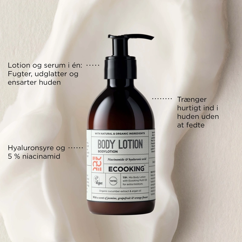 Ecooking Bodylotion is een heerlijke bodylotion met hydraterende, verzachtende en verstevigende eigenschappen. Geschikt voor alle huidtypen en leeftijden. Met een frisse geur van jasmijn, druif en oranjebloesem. Bodylotion bevat een effectieve cocktail van ingrediënten, waaronder: - Hyaluronzuur, ook wel HA genoemd, dat je huid hydrateert en in de onderste huidlagen werkt, waardoor de huid de boost van hyaluronzuur en collageen krijgt die we met de leeftijd verliezen. Een unieke booster voor de huid die hydrateert en fijne lijntjes en rimpels opvult. - Niacinamide, beter bekend als vitamine B3, dat de huid helpt fijne lijntjes te verminderen en de huidstructuur te herstellen. Met een hoog percentage niacinamide (5%) krijgt je huid een effectieve remedie tegen pigmentvlekken, en tegelijkertijd wordt je huid gladder en heeft ze een heerlijke gloed. Daarnaast is de Body Lotion gevuld met ingrediënten zoals: - Natuurlijke olijfolie - Biologische sheaboter - Natuurlijke jojoba-olie - Biologische arganolie - Biologische glycerine - Natuurlijke Aloë vera - Biologisch komkommerwater - Natuurlijke vitamine E - Natuurlijke zonnebloemolie Voordelen: - Bodylotion - Hydraterend, gladmakend en verstevigend - Voor alle huidtypen - Geeft een gladdere huid en een mooie gloed - Vermindert fijne lijntjes en pigmentvlekken - Frisse geur van jasmijndruif en oranjebloesem - Veganistisch en dermatologisch getest Toepassing: - Wrijf de bodylotion dagelijks na het bad in - Omdat de bodylotion een lichte consistentie heeft, is deze gemakkelijk en snel te verwerken en trekt deze gemakkelijk in de huid Ingrediëntenlijst: Aqua, Niacinamide, Polyglyceryl-6 Distearate, Butyrospermum Parkii Butter, Coco-Caprylate/Caprate, Hydrogenated Olive Oil Decyl Esters, Hydrogenated Ethylhexyl Olivate, Argania Spinosa Kernel Oil, Glycerin, Aloë Barbadensis-bladwater, natriumacrylaten/Beheneth-25-methacrylaatcrosspolymeer, onverzeepbare bestanddelen van gehydrogeneerde olijfolie, gehydrogeneerd polydeceen, jojoba-esters, natriumlevulinaat, natriumpolyacrylaatzetmeel, kaliumsorbaat, Cucumis sativus-vruchtwater, citroenzuur, tocoferol, laurylglucoside, Helianthus annuus-zaadolie, natriumhyaluronaat, natriumbenzoaat, parfum, Citrus aurantium-schilolie, Pogostemon cablin-olie, linalool, terpineol, geraniol, geranylacetaat, limoneen, Cananga odorata-olie/extract, linalylacetaat, citronellol, pineen, cinnamylalcohol, eugenol, farnesol, benzylbenzoaat, citral