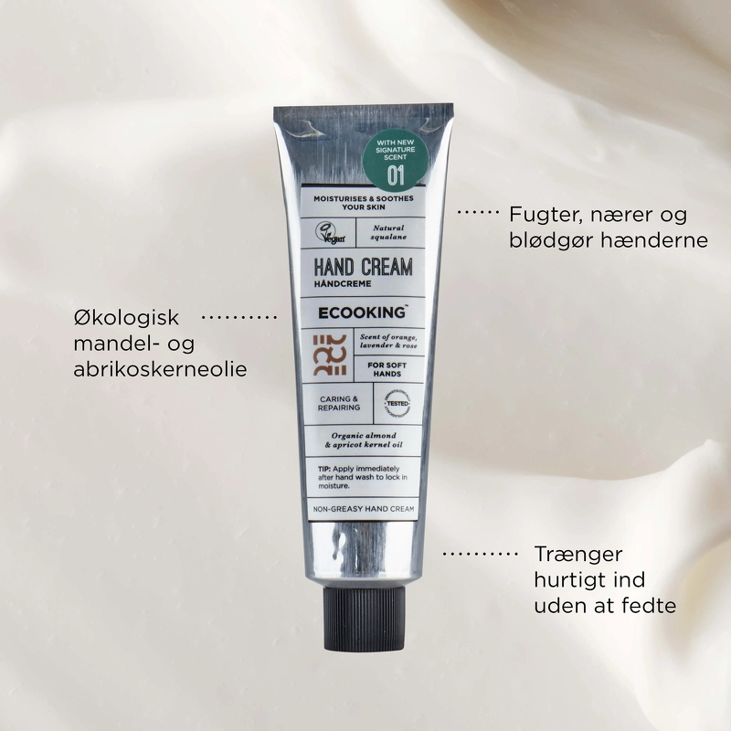 Ecooking Handcrème is een lichte, snel intrekkende handcrème met heerlijke geuren van sinaasappel, lavendel en roos. Ondanks de moeiteloze en discrete toepassing, hydrateert de handcrème de huid optimaal dankzij de beste biologische oliën, zonder je handen vettig te maken. De oliën zijn afkomstig van abrikozenpitten, amandelen en olijven, die allemaal rijk zijn aan vitaminen, antioxidanten en vetzuren. Dit betekent dat je handen worden omhuld met een rijke verzorging en voeding die zelfs de meest ruwe handen verzacht. Tegelijkertijd heeft de crème ook beschermende en verzachtende eigenschappen, zodat je handen – en je visitekaartje wanneer je de wereld begroet – in topconditie blijven. Voordelen: - Handcrème - Licht en trekt snel in - Geurnoten van sinaasappel, lavendel en roos - Zorgt voor intensieve hydratatie zonder vettig te voelen - Rijk aan vitaminen, antioxidanten en vetzuren - Maakt ruwe handen zacht - Heeft beschermende en gladmakende eigenschappen - Veganistisch en dermatologisch getest Gebruik: - Smeer uw handen naar behoefte in met de handcrème, bijvoorbeeld 's ochtends, 's avonds of 's avonds. na het wassen Ingrediëntenlijst:, Aqua, Prunus Amygdalus Dulcis-olie, Prunus Armeniaca-pitolie, Cetearylalcohol, Glycerine, Butyrospermum Parkii-boter, Glycerylstearaatcitraat, Squalaan, Natriumlevulinaat, Citroenzuur, Kaliumsorbaat, Natriumcetearylsulfaat, Glycerylcaprylaat, Parfum, Citrus Aurantium-schilolie, Limoneen, Linalool, Linalylacetaat, Pelargonium Graveolens-bloemolie, Geraniol, Citronellol