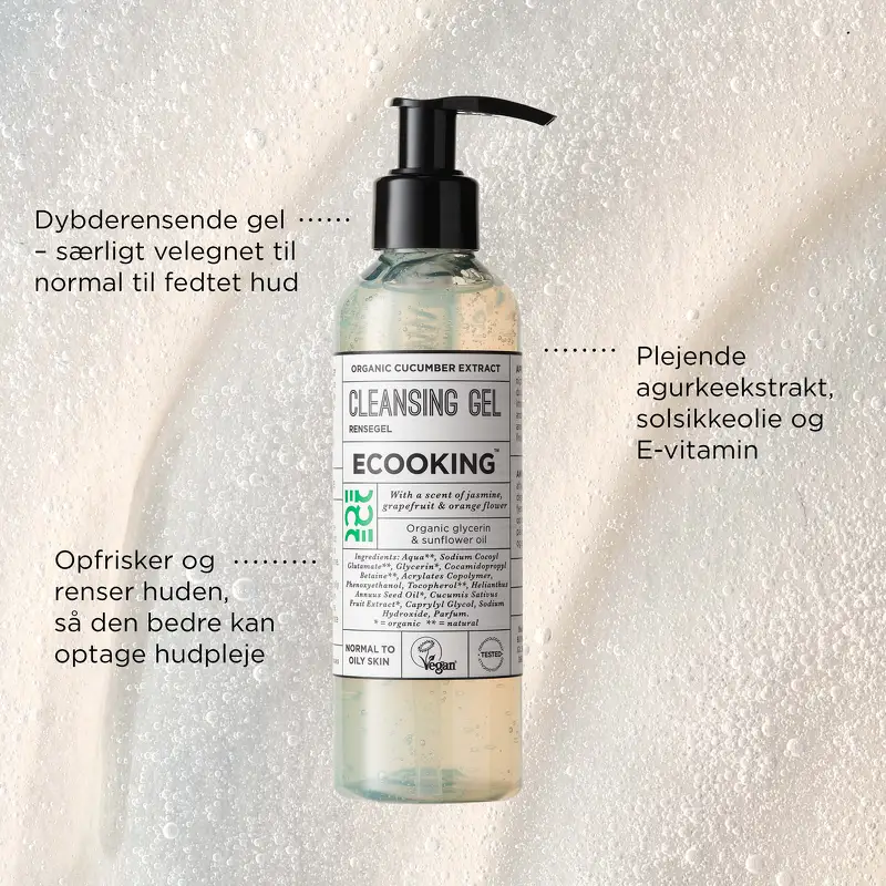 Ecooking Cleansing Gel is een reinigende gezichtsgel voor de normale en vette huid. De reinigingsgel reinigt je huid diep in de ochtend en avond en voorziet je huid tegelijkertijd van vocht en verzorging. Deze reinigingsgel heeft een frisse geur van jasmijn, druif en oranjebloesem en bevat ingrediënten zoals: biologische zonnebloemolie, natuurlijke vitamine E en biologisch komkommerextract. Voordelen: - Reinigingsgel - Aanbevolen voor de normale en vette huid - Reinigt de huid diep - Hydraterend en voedend - Frisse geur van jasmijn, druif en oranjebloesem - Verzachtend - Verstevigend - Heeft een kalmerende en verfrissende werking - Laat de huid schoon, fris en verzorgd achter Gebruik: - Breng een pompje reinigingsgel aan op je handpalmen - Laat het schuimen en masseer het in je gezicht, hals en decolleté - Spoel af met stromend water - Gebruik 's ochtends en 's avonds - Als je maar één keer per dag reinigt, doe dit dan 's avonds - Eindig met serum en gezichtscrème.
