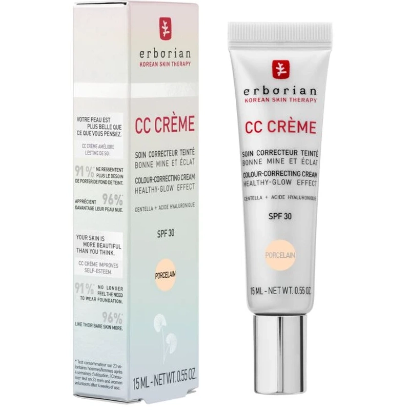 Erborian CC Crème Porcelain is een unieke formule met ingekapselde pigmenten die van kleur veranderen bij contact met de huid. Op het eerste gezicht lijkt de crème wit, maar na het aanbrengen past hij zich precies aan uw huidskleur aan. Hij egaliseert en verbetert de teint en geeft een lichte dekking met een natuurlijke finish. De lichte textuur smelt in de huid en laat een ongelooflijk licht laagje achter op het huidoppervlak dat de huidtextuur en kleine oneffenheden direct vervaagt. CC Crème is verrijkt met een extract van Centella Asiatica - een actief ingrediënt dat bekendstaat om zijn kalmerende eigenschappen. Het voedt uw huid en fungeert als een dagelijks huidverzorgingsproduct, met SPF 30 bescherming tegen de schadelijke effecten van de zon. Perfect voor iedereen die op zoek is naar een getinte huidverzorgingsproduct met een lichte dekking om de teint te egaliseren en de huid te versterken met een gezonde uitstraling, terwijl het tegelijkertijd zeer natuurlijke resultaten oplevert. Het laat uw huid er gladder uitzien met een natuurlijke glans. De perfecte combinatie van huidverzorging en make-up! Geschikt voor alle huidtypen. Voordelen: - CC-crème - Voor lichte huidtinten - SPF 30 - Unieke formule - Past zich aan de huidtint aan - Egaliseert de huidtint - Lichte dekking - Natuurlijke finish - Lichte textuur - Vervaagt de huidtextuur - Verrijkt met Centella Asiatica - Verzachtend - Lichte dekking - Gezonde uitstraling - Natuurlijke resultaten - Maakt de huid gladder - Natuurlijke gloed - Geschikt voor alle huidtypen - Unisex - Dermatologisch getest - Koreaanse huidverzorging Gebruik: - Aanbrengen op het gezicht na of in plaats van uw vochtinbrengende crème