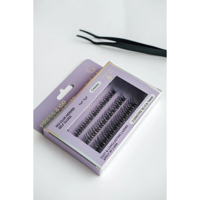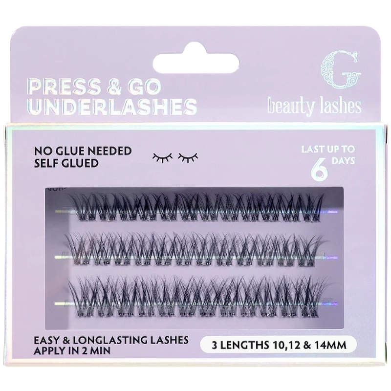 G Beauty Lashes Press & Go Underlashes zijn zelfklevende underlashes die je tot wel 6 dagen een natuurlijke en elegante look geven zonder lijm. De wimpers hebben een speciale zelfklevende film die wordt geactiveerd door de warmte en het vocht van je huid. Wanneer je ze onder je eigen wimpers plaatst en lichtjes aandrukt, hechten ze zich - volledig zonder lijm. Voordelen: - Zelfklevende wimpers - Natuurlijke en elegante look - Blijft tot 6 dagen zitten - Geen lijm nodig - Geactiveerd door de warmte en vochtigheid van de huid - Gemakkelijk aan te brengen onder de natuurlijke wimpers - Veilige en zachte bevestiging - Snelle press & go applicatie Toepassing: - Krul je wimpers met een wimperkruller - Haal de geselecteerde wimpers voorzichtig uit de verpakking - Breng Press & Go Lashes aan onder je eigen wimpers - Druk de wimpers met een pincet tegen je eigen wimpers - OPMERKING: Als je de houdbaarheid wilt verlengen, kun je Underlash Glue & Bond gebruiken Ingrediëntenlijst: Acrylatencopolymeer Water Propyleenglycol Ci77266