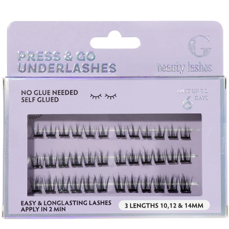 G Beauty Lashes Press & Go Underlashes zijn zelfklevende underlashes die je tot wel 6 dagen een natuurlijke en elegante look geven zonder lijm. De wimpers hebben een speciale zelfklevende film die wordt geactiveerd door de warmte en het vocht van je huid. Wanneer je ze onder je eigen wimpers plaatst en lichtjes aandrukt, hechten ze zich - volledig zonder lijm. Voordelen: - Zelfklevende wimpers - Natuurlijke en elegante look - Blijft tot 6 dagen zitten - Geen lijm nodig - Geactiveerd door de warmte en vochtigheid van de huid - Gemakkelijk aan te brengen onder de natuurlijke wimpers - Veilige en zachte bevestiging - Snelle press & go applicatie Toepassing: - Krul je wimpers met een wimperkruller - Haal de geselecteerde wimpers voorzichtig uit de verpakking - Breng Press & Go Lashes aan onder je eigen wimpers - Druk de wimpers met een pincet tegen je eigen wimpers - OPMERKING: Als je de houdbaarheid wilt verlengen, kun je Underlash Glue & Bond gebruiken Ingrediëntenlijst: Acrylatencopolymeer Water Propyleenglycol Ci77266