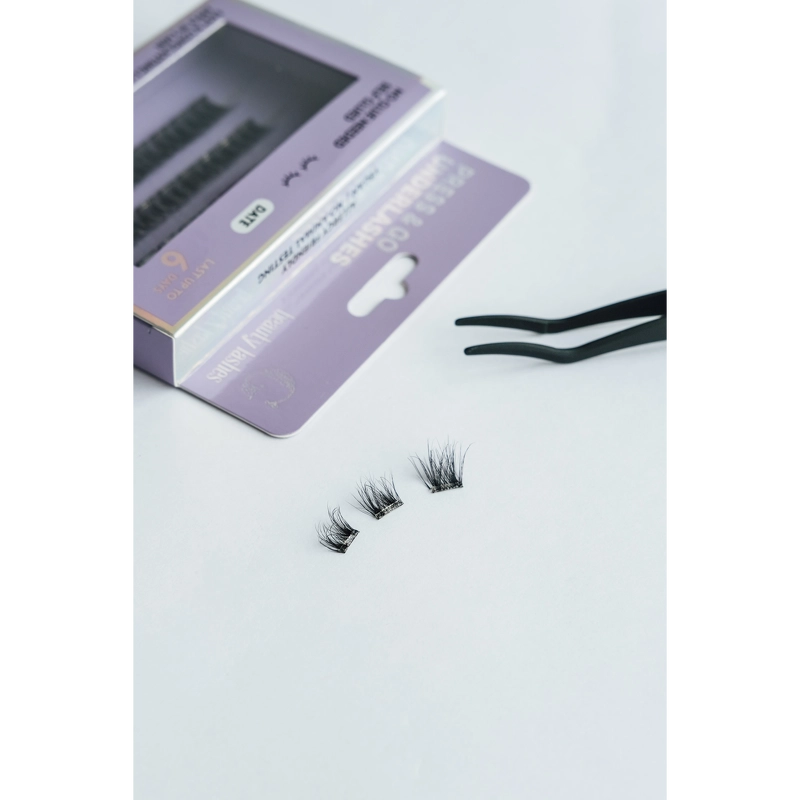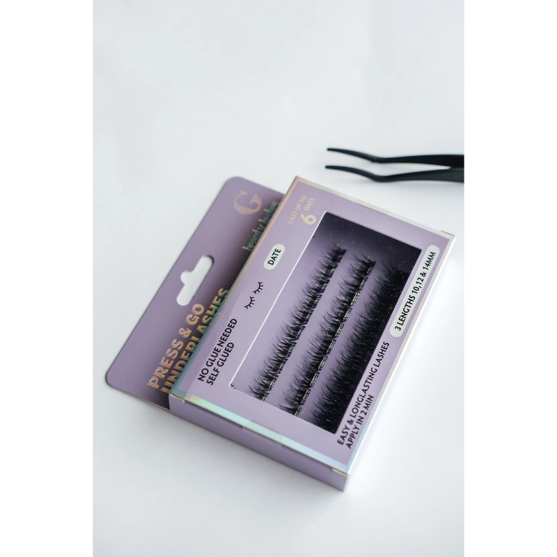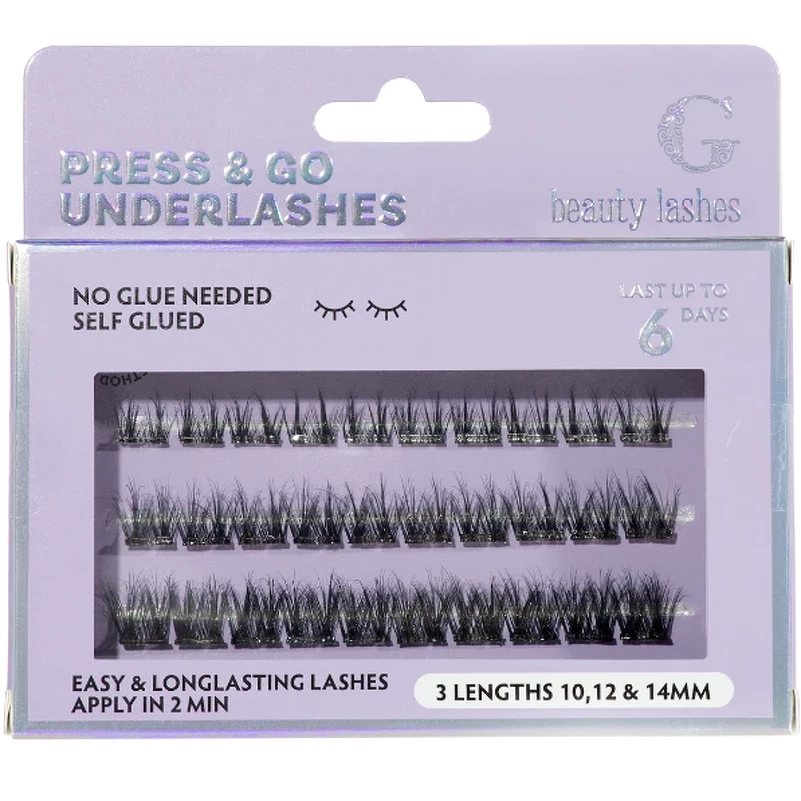 G Beauty Lashes Press & Go Underlashes zijn zelfklevende underlashes die je tot wel 6 dagen een natuurlijke en elegante look geven zonder lijm. De wimpers hebben een speciale zelfklevende film die wordt geactiveerd door de warmte en het vocht van je huid. Wanneer je ze onder je eigen wimpers plaatst en lichtjes aandrukt, hechten ze zich - volledig zonder lijm. Voordelen: - Zelfklevende wimpers - Natuurlijke en elegante look - Blijft tot 6 dagen zitten - Geen lijm nodig - Geactiveerd door de warmte en vochtigheid van de huid - Gemakkelijk aan te brengen onder de natuurlijke wimpers - Veilige en zachte bevestiging - Snelle press & go applicatie Toepassing: - Krul je wimpers met een wimperkruller - Haal de geselecteerde wimpers voorzichtig uit de verpakking - Breng Press & Go Lashes aan onder je eigen wimpers - Druk de wimpers met een pincet tegen je eigen wimpers - OPMERKING: Als je de houdbaarheid wilt verlengen, kun je Underlash Glue & Bond gebruiken Ingrediëntenlijst: Acrylatencopolymeer Water Propyleenglycol Ci77266