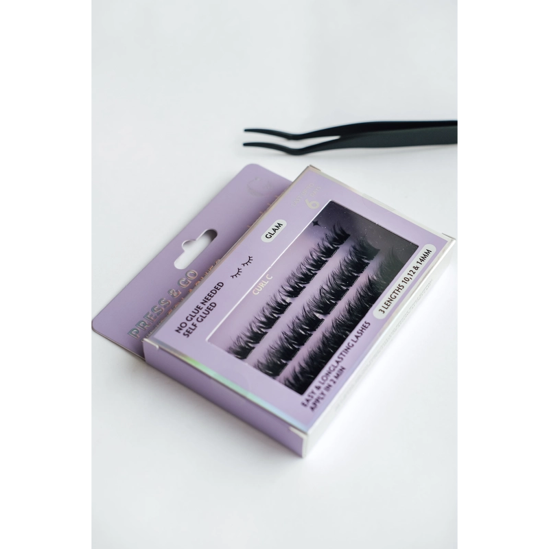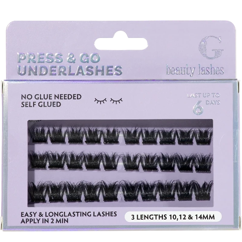 G Beauty Lashes Press & Go Underlashes zijn zelfklevende underlashes die je tot wel 6 dagen een natuurlijke en elegante look geven zonder lijm. De wimpers hebben een speciale zelfklevende film die wordt geactiveerd door de warmte en het vocht van je huid. Wanneer je ze onder je eigen wimpers plaatst en lichtjes aandrukt, hechten ze zich - volledig zonder lijm. Voordelen: - Zelfklevende wimpers - Natuurlijke en elegante look - Blijft tot 6 dagen zitten - Geen lijm nodig - Geactiveerd door de warmte en vochtigheid van de huid - Gemakkelijk aan te brengen onder de natuurlijke wimpers - Veilige en zachte bevestiging - Snelle press & go applicatie Toepassing: - Krul je wimpers met een wimperkruller - Haal de geselecteerde wimpers voorzichtig uit de verpakking - Breng Press & Go Lashes aan onder je eigen wimpers - Druk de wimpers met een pincet tegen je eigen wimpers - OPMERKING: Als je de houdbaarheid wilt verlengen, kun je Underlash Glue & Bond gebruiken Ingrediëntenlijst: Acrylatencopolymeer Water Propyleenglycol Ci77266