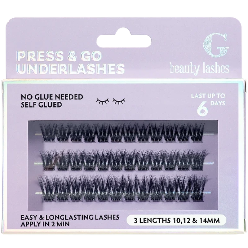 G Beauty Lashes Press & Go Underlashes zijn zelfklevende underlashes die je tot wel 6 dagen een natuurlijke en elegante look geven zonder lijm. De wimpers hebben een speciale zelfklevende film die wordt geactiveerd door de warmte en het vocht van je huid. Wanneer je ze onder je eigen wimpers plaatst en lichtjes aandrukt, hechten ze zich - volledig zonder lijm. Voordelen: - Zelfklevende wimpers - Natuurlijke en elegante look - Blijft tot 6 dagen zitten - Geen lijm nodig - Geactiveerd door de warmte en vochtigheid van de huid - Gemakkelijk aan te brengen onder de natuurlijke wimpers - Veilige en zachte bevestiging - Snelle press & go applicatie Toepassing: - Krul je wimpers met een wimperkruller - Haal de geselecteerde wimpers voorzichtig uit de verpakking - Breng Press & Go Lashes aan onder je eigen wimpers - Druk de wimpers met een pincet tegen je eigen wimpers - OPMERKING: Als je de houdbaarheid wilt verlengen, kun je Underlash Glue & Bond gebruiken Ingrediëntenlijst: Acrylatencopolymeer Water Propyleenglycol Ci77266
