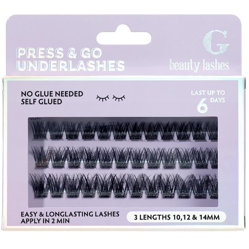 G Beauty Lashes Press & Go Underlashes zijn zelfklevende underlashes die je tot wel 6 dagen een natuurlijke en elegante look geven zonder lijm. De wimpers hebben een speciale zelfklevende film die wordt geactiveerd door de warmte en het vocht van je huid. Wanneer je ze onder je eigen wimpers plaatst en lichtjes aandrukt, hechten ze zich - volledig zonder lijm. Voordelen: - Zelfklevende wimpers - Natuurlijke en elegante look - Blijft tot 6 dagen zitten - Geen lijm nodig - Geactiveerd door de warmte en vochtigheid van de huid - Gemakkelijk aan te brengen onder de natuurlijke wimpers - Veilige en zachte bevestiging - Snelle press & go applicatie Toepassing: - Krul je wimpers met een wimperkruller - Haal de geselecteerde wimpers voorzichtig uit de verpakking - Breng Press & Go Lashes aan onder je eigen wimpers - Druk de wimpers met een pincet tegen je eigen wimpers - OPMERKING: Als je de houdbaarheid wilt verlengen, kun je Underlash Glue & Bond gebruiken Ingrediëntenlijst: Acrylatencopolymeer Water Propyleenglycol Ci77266