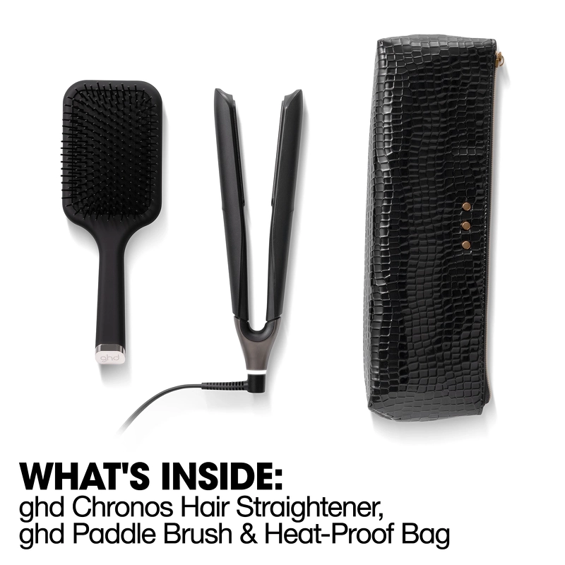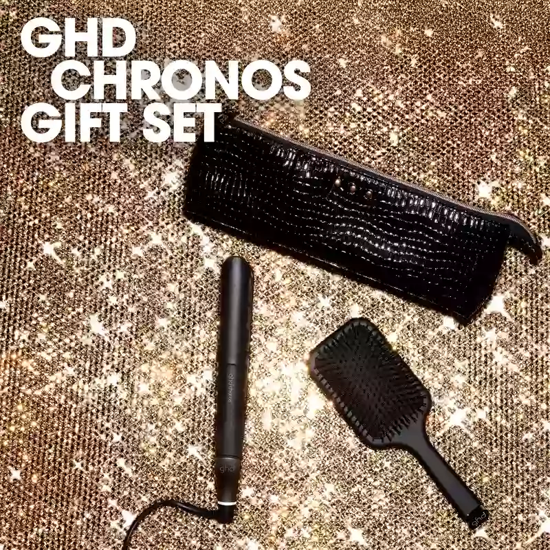 Of je nu droomt van veerkrachtige krullen of glamoureus, glad gestyled haar, je kunt deze kerst vijfsterren haarcadeaus geven met de ghd Cherry Chic-collectie en de ghd Chronos™ kerstcadeauset. De set bevat ghd's nummer 1 styler – de ghd Chronos™ styler met HD Motion-Responsive™-technologie – evenals de veelzijdige All-Rounder platte borstel en een hittebestendige toilettas. De ghd Chronos™ is ontworpen om je haar in slechts één beweging te transformeren en levert kristalheldere resultaten met drie keer snellere styling die 24 uur aanhoudt. Dankzij de HD Motion-Responsive™-technologie reageert hij twee keer zo snel en past hij zich aan je bewegingen aan voor ultrasnelle, persoonlijke styling. Dat betekent perfect haar in slechts één beweging, zodat je je look met precisie en snelheid kunt transformeren, zonder extreme hitteschade⁶. Dankzij bewegingsgevoelige technologie past de ghd Chronos™ continu zijn vermogen aan voor ultieme nauwkeurigheid bij het meten van de warmte, waarbij de temperatuur op de perfecte 185 °C blijft voor het stylen. Het sensorlampje geeft aan wanneer het tijd is om te stylen en met stijlen die tot 24 uur houden, ziet je haar er de hele dag fris uit met extra bescherming tegen breuk. Ervaar superieure resultaten met keramische platen met een ultraglanzende coating die zorgen voor een gemakkelijke, soepele styling die het haar glad maakt, polijst en pluis elimineert, voor tot 85% meer glans. Het opnieuw ontworpen wishbone-scharnier zorgt voor een perfecte uitlijning van de platen en ultieme controle, zodat je gemakkelijk glad, steil haar, vederlichte krullen of elegante golven met precisie creëert. De gebogen vorm, ergonomisch ontworpen voor comfort en controle, maakt het gemakkelijk om met een simpele handbeweging van steil naar gestyled haar te gaan - #NietGewoonEenStijltang, maar jouw snelkoppeling naar veelzijdige styling. Met universele spanning, een professionele kabel van 2,7 m, plaatbeschermer en automatische slaapstand na 10 minuten inactiviteit, combineert deze tool naadloos schoonheid, veiligheid en prestaties. Bij je styler is de All-Rounder Flat Brush inbegrepen – dé borstel voor het gladstrijken van middellang tot lang haar, waardoor het föhnen van grote delen veel gemakkelijker wordt. De set bevat: - 1 stuk ghd Chronos Styler - Zwart - 1 stuk ghd The All-Rounder Paddle Brush - 1 stuk ghd Tas