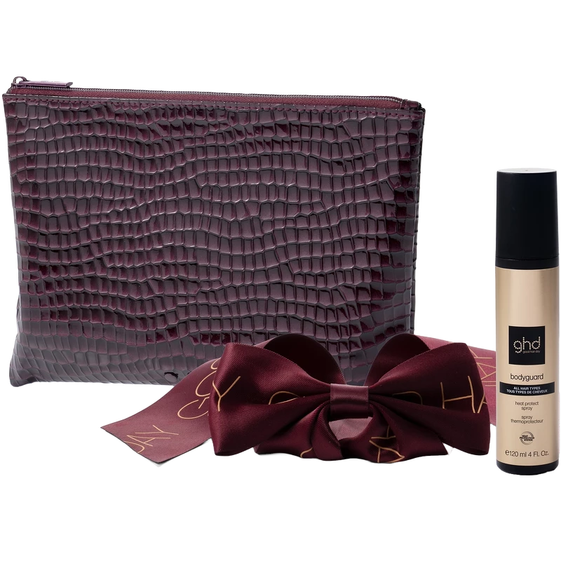 Trakteer uzelf op een luxueuze stylingervaring met de ghd Style Gift Set uit onze Cherry Chic-collectie – een ode aan tijdloze glamour, verpakt in rijke, weelderige tinten. Deze collectie is uw must-have dit seizoen als u op zoek bent naar moeiteloze luxe en de perfecte finish. In deze kersenkleurige toilettas vindt u de ghd Bodyguard Heat Protection Spray, geschikt voor alle haartypes en biedt premium bescherming tegen hittestyling. Deze lichtgewicht spray, perfect samengesteld voor alle haartypes, biedt een onzichtbare bescherming tegen dagelijkse hitteschade en zorgt voor glad, glanzend en beschermd haar – bij elke stijl. Maak uw stijl compleet met de Limited Edition ghd Haarclip met satijnen strik – de perfecte finishing touch voor uw kerstlook. ghd Bodyguard is eenvoudig te gebruiken: spray eenvoudig op handdoekdroog haar van de wortels tot de punten of op droog haar vóór het stylen met hitte. Set bevat: - 1 st. ghd Bodyguard Heat Protect Spray 120 ml - Origineel - 1 st. ghd toilettas#