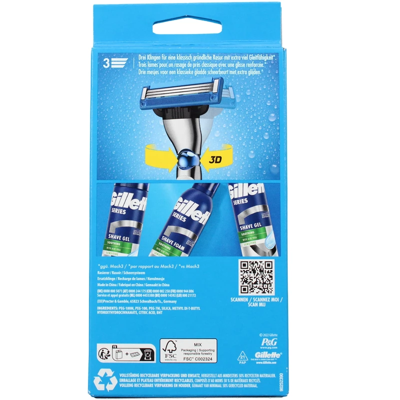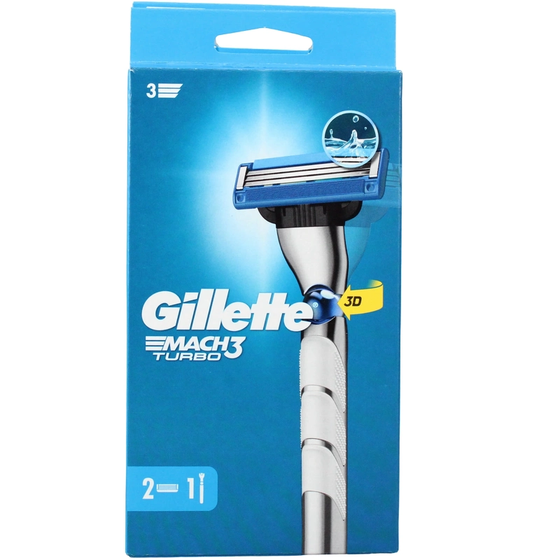 Gillette Mach3 Turbo 3D Motion Razor + 2 scheermesjes is een efficiënt scheermes met twee scheerkoppen. Gillette Mach3 Turbo 3D Motion – het geavanceerde scheermes dat in alle richtingen beweegt om je gelaatstrekken met ultieme precisie te volgen. De unieke 3D-bewegende handgreep past zich automatisch aan je contouren aan, voor een gladde en gelijkmatige scheerbeurt – of je nu je baardrand of snor bijwerkt of je hele gezicht scheert. De metalen handgreep met elastomeer grip geeft je volledige controle en een stevige grip, zelfs als het scheermesje nat is. Elke beweging voelt natuurlijk aan en je raakt gemakkelijk elk haartje – zelfs op moeilijk bereikbare plekken. De drie ultrascherpe mesjes zijn gemaakt van versterkt roestvrij staal met atomaire koolstof, wat zorgt voor een lange levensduur en tot wel 15 comfortabele scheerbeurten per mesje. De brede Lubrastrip glijstrip wordt geactiveerd bij contact met water en vormt een beschermende film, waardoor het scheermesje zacht over de huid glijdt en de kans op irritatie en roodheid minimaliseert. Dankzij de geavanceerde technologie combineert de Mach3 Turbo 3D Motion een lichte scheerbeurt met precisie en comfort – perfect voor wie een compromisloze scheerbeurt wil. Details: - Scheermes - 3D-beweegbare handgreep past zich aan alle gezichtscontouren aan - 3 ultrascherpe mesjes van versterkt roestvrij staal - Tot 15 comfortabele scheerbeurten per mesje - Brede Lubrastrip voor extra glijvermogen en bescherming - Ergonomische metalen handgreep met antislipgrip