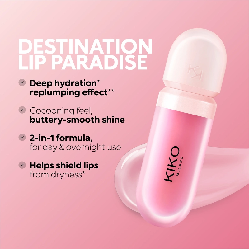 KIKO Milano Kissable Lip Paradise Replumping Lip Mask is een hydraterend en verstevigend lippenmasker dat een stralende, voedende laag op de lippen vormt, waardoor ze zacht, glad en voller lijken. De verzachtende formule met Italiaans frambozenextract, hyaluronzuur en sheaboter biedt intensieve hydratatie en diepe verzorging, waardoor de lippen er gladder, voller en verzorgder uitzien. Het is perfect voor dagelijks gebruik of als regenererend nachtmasker dat de natuurlijke schoonheid van de lippen revitaliseert. Dit lippenmasker heeft een unieke, sensuele en rijke textuur die op de lippen smelt en direct een gevoel van welzijn en een stralende, delicate roze finish geeft, terwijl het zowel de lippen als de zintuigen verwent met een heerlijke vanillegeur. Het kan zowel voor als na het aanbrengen van make-up worden gebruikt. Voordelen: - Lippenmasker - 2-in-1 verzorging voor dag en nacht - Intensief hydraterend - Biedt diepe verzorging - Maakt de lippen gladder, voller en verzorgder - Geeft direct een gevoel van welzijn - Kan gebruikt worden voor en na het aanbrengen van make-up - Stralende, delicate roze finish - Rijke en smeltende textuur - Exquise vanillegeur Gebruik: - Breng een laagje aan op schone lippen zonder make-up voor zachte, verzorgde lippen - Breng een dikker laagje aan voor het slapengaan, zodat het werkt als een regenererend masker dat de hele nacht op de lippen blijft zitten Ingrediëntenlijst: TRIISOSTEARINE, OLEÏNE-/LINOLÏNE-/LINOLENINE-POLYGLYCERIDEN, BUTYROSPERMUM PARKII BOTER (BUTYROSPERMUM PARKII (SHEA) BOTER), SQUALANE, RICINUS COMMUNIS ZAADOLIE (RICINUS COMMUNIS (CASTOR) ZAADOLIE) TRIHYDROXYSTEARINE, SILICA DIMETHYL SILYLAAT, GEHYDROGENEERDE CASTOROLIE, DAEMONOROPS DRACO-EXTRACT, PARFUM (GEURSTOF), HELIANTHUS ANNUUS ZAADOLIE (HELIANTHUS ANNUUS (ZONNEBLOEM) ZAADOLIE), COPERNICIA CERIFERA CERA (COPERNICIA CERIFERA (CARNAUBA) WAS / CIRE DE CARNAUBA), SACCHAROMYCES FERMENTFILTRAAT, TOCOFEROL, NATRIUMHYALURONAAT, RUBUS IDAEUS FRUITEXTRACT (RUBUS IDAEUS (FRABRAAM) FRUITEXTRACT), CI 15850 (ROOD 7 MEER), CI 19140 (GEEL 5 MEER).